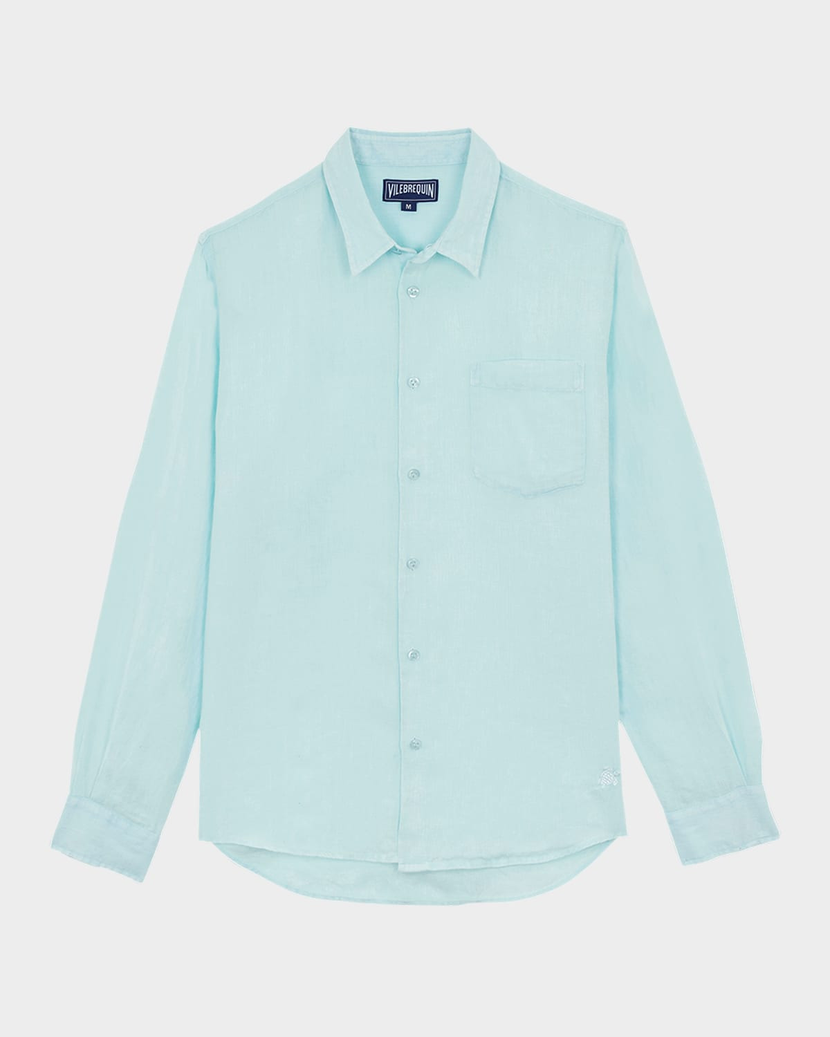 - Vilebrequin sport shirt crafted from lightweight, breathable linen - Spread collar - Tonal button closure - Chest patch pocket - Long sleeve; approx. 24.0"L - Two-button cuffs - Classic fit - Hand wash, machine wash cold, line dry - Made in Morocco