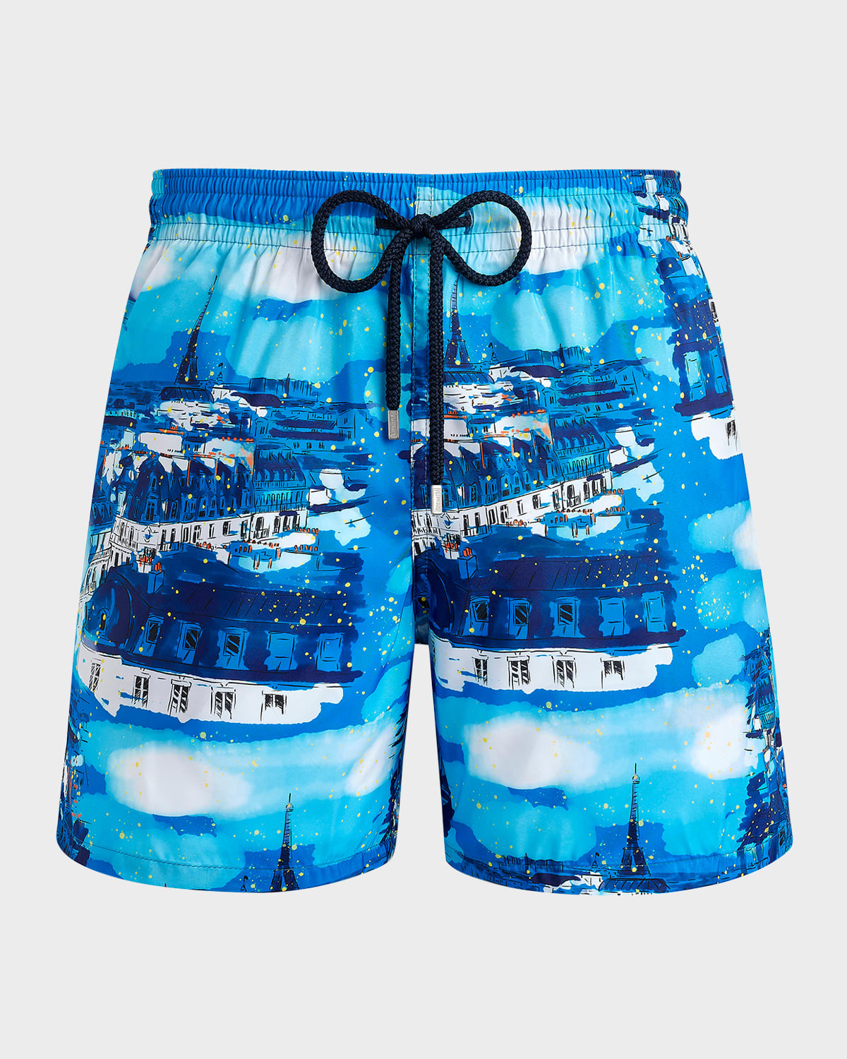 - Vilebrequin swim shorts with allover Paris print - Elasticized drawstring waist - Side slip pockets - Back zip pocket - Eyelets at back allow water to drain - Relaxed legs - Polyester - Lining: Cotton - Hand wash, machine wash cold, line dry - Made in Morocco - Model is 6'1"/185cm.