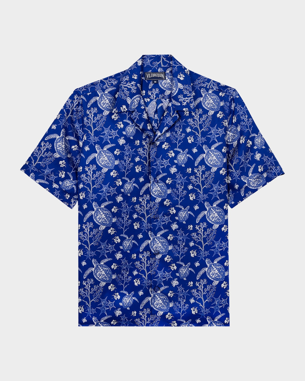- Vilebrequin bowling shirt in lustrous silk highlighted with an allover turtle print - Approx. 28"L from shoulder to hem - Notch collar - Button placket - Short sleeves - Pleated back yoke - Straight hem - Classic fit - Silk - Hand wash, machine wash cold, line dry - Made in Morocco