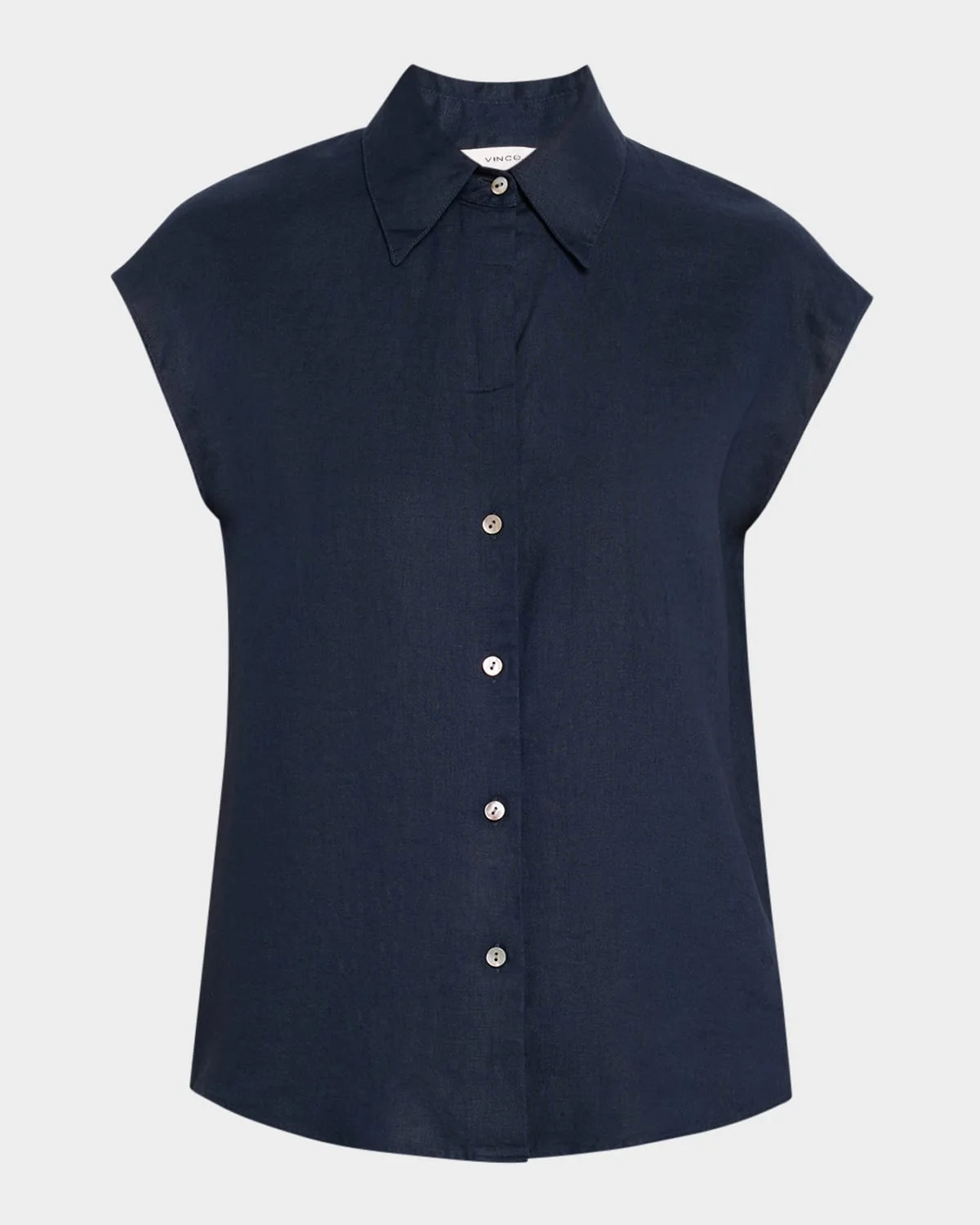 - Vince crisp blouse with mother-of-pearl buttons - Spread collar; button placket - Cap sleeves - Yoked back - Straight fit - Curved hem - Linen - Imported - Model is 5'10"/177cm.