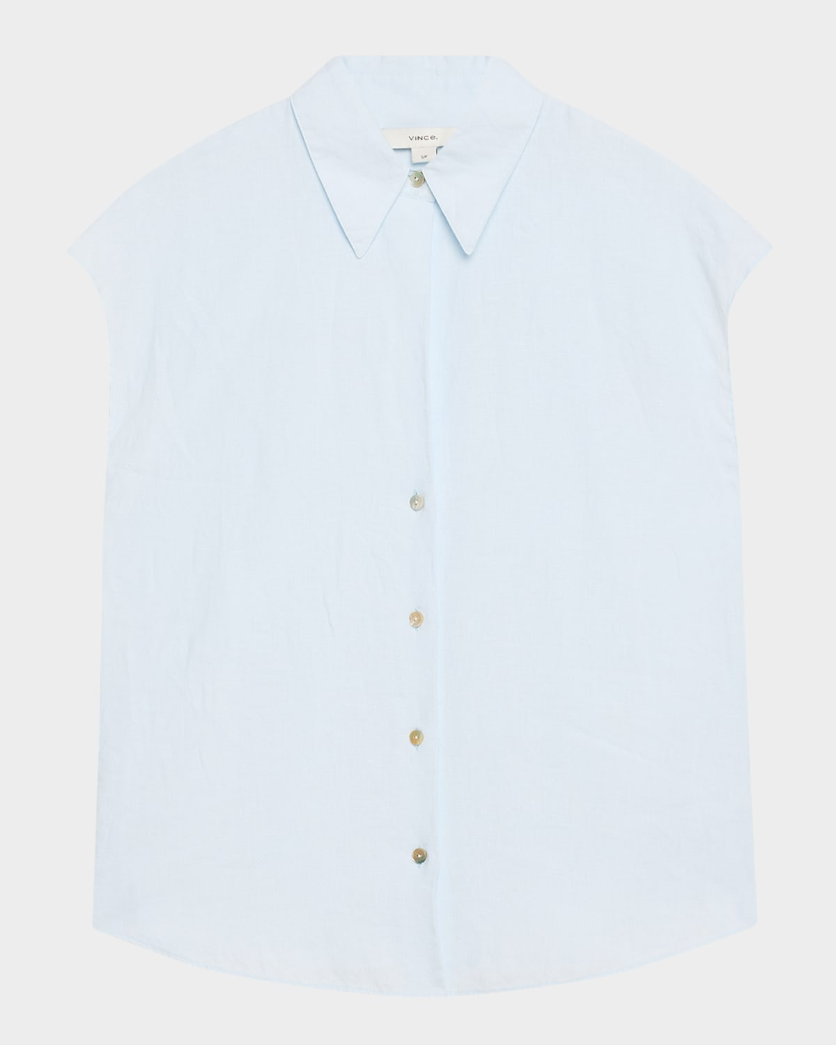 - Vince crisp blouse with mother-of-pearl buttons - Spread collar; button placket - Cap sleeves - Yoked back - Straight fit - Curved hem - Linen - Imported - Model is 5'10"/177cm.