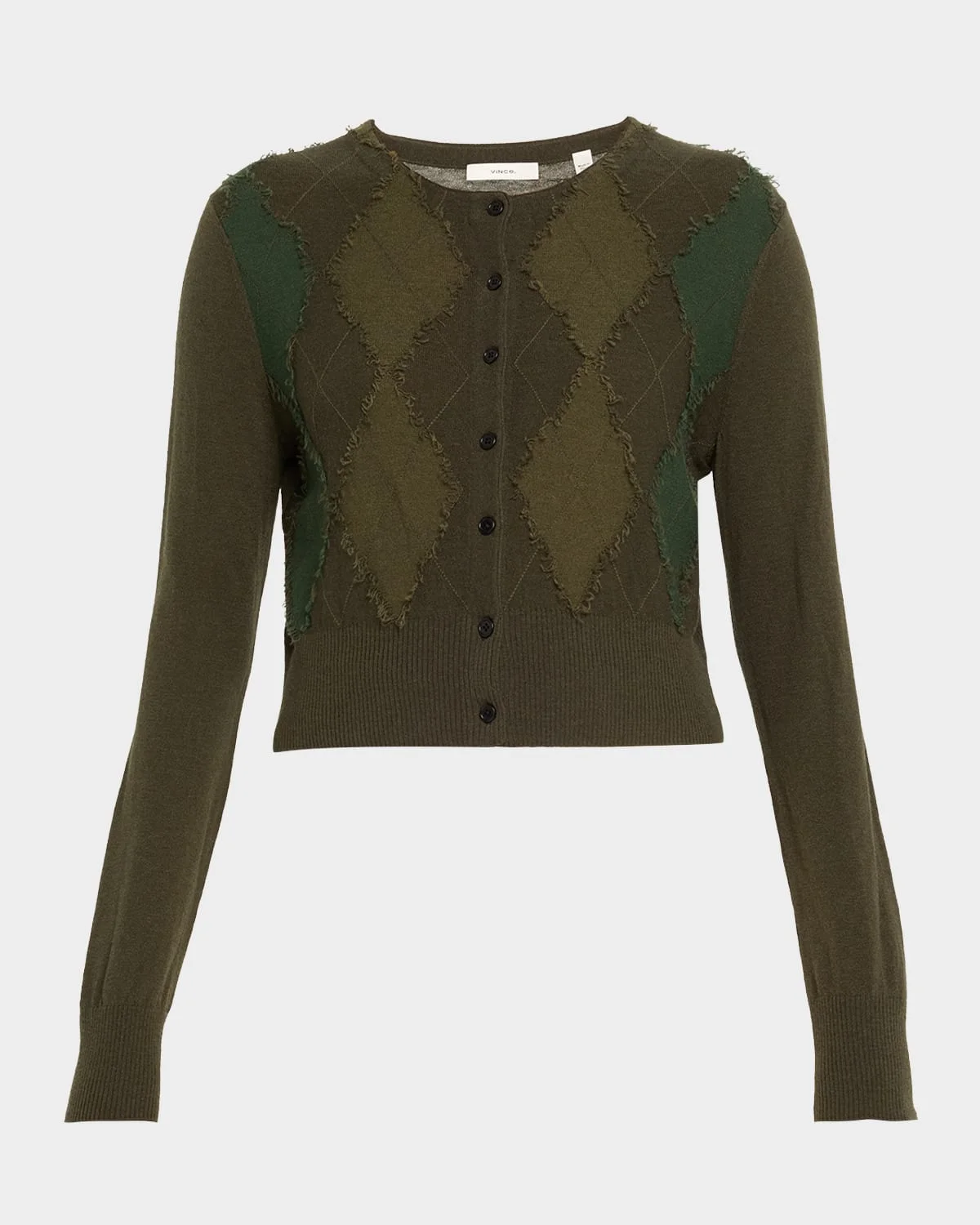 Luxurious wool and cashmere cardigan with handcut argyle detailing by Vince. Crew neckline Long sleeves Classic fit Cropped length Pullover style Wool/polyester/cashmere Hand wash cold or dry clean Imported