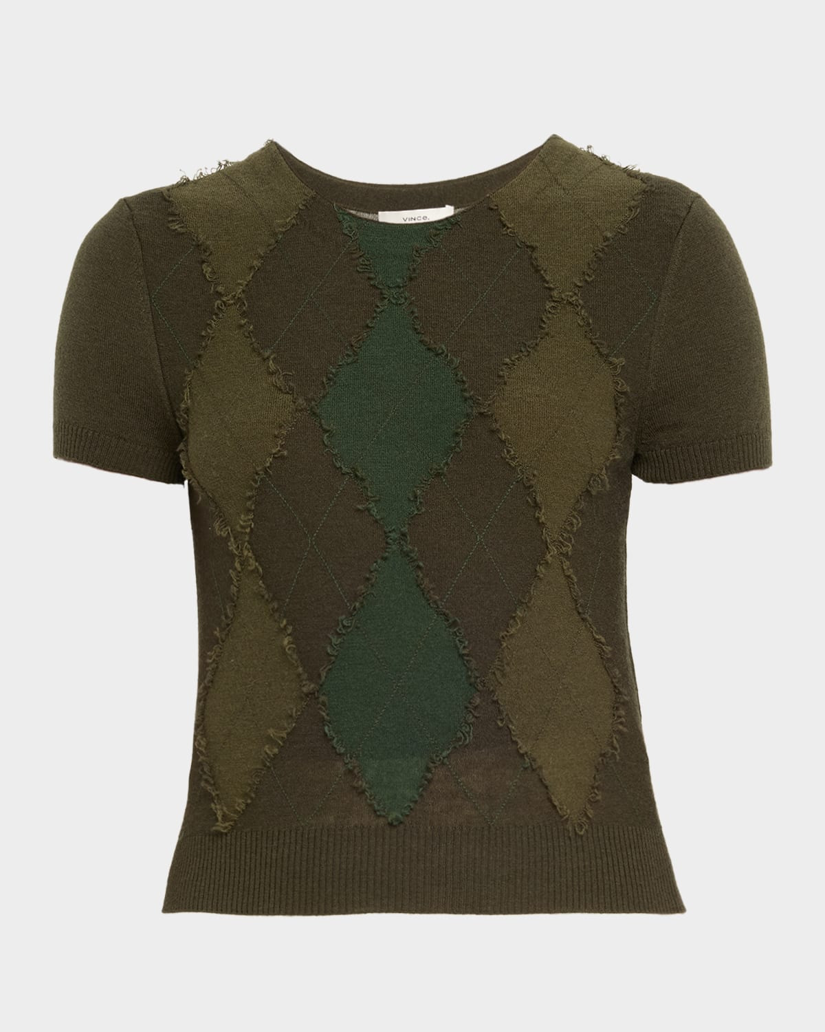 Luxurious wool and cashmere sweater with handcut argyle detailing by Vince. Crew neckline Short sleeves Classic fit Hem sits at the hip Pullover style Wool/polyester/cashmere Hand wash cold or dry clean Imported