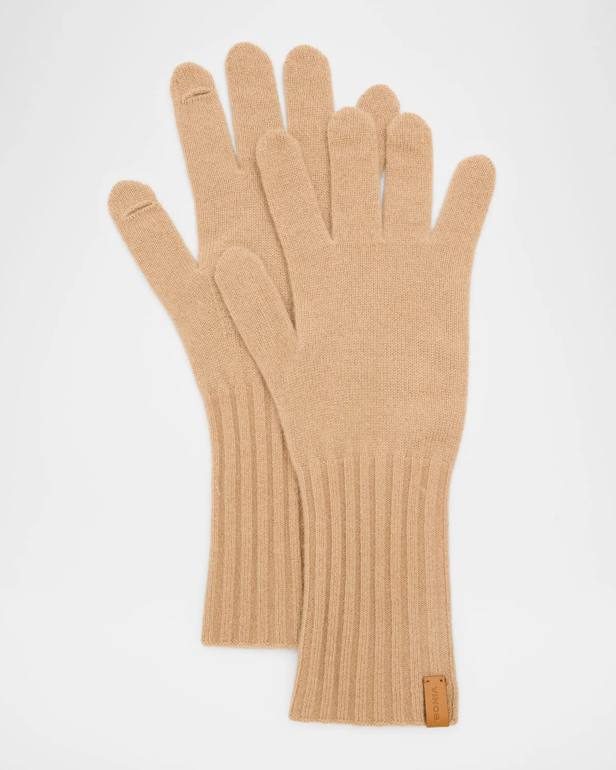 Vince knit gloves in cashmere Long, ribbed cuffs Logo tab accent One size fits most Hand wash or dry clean Imported