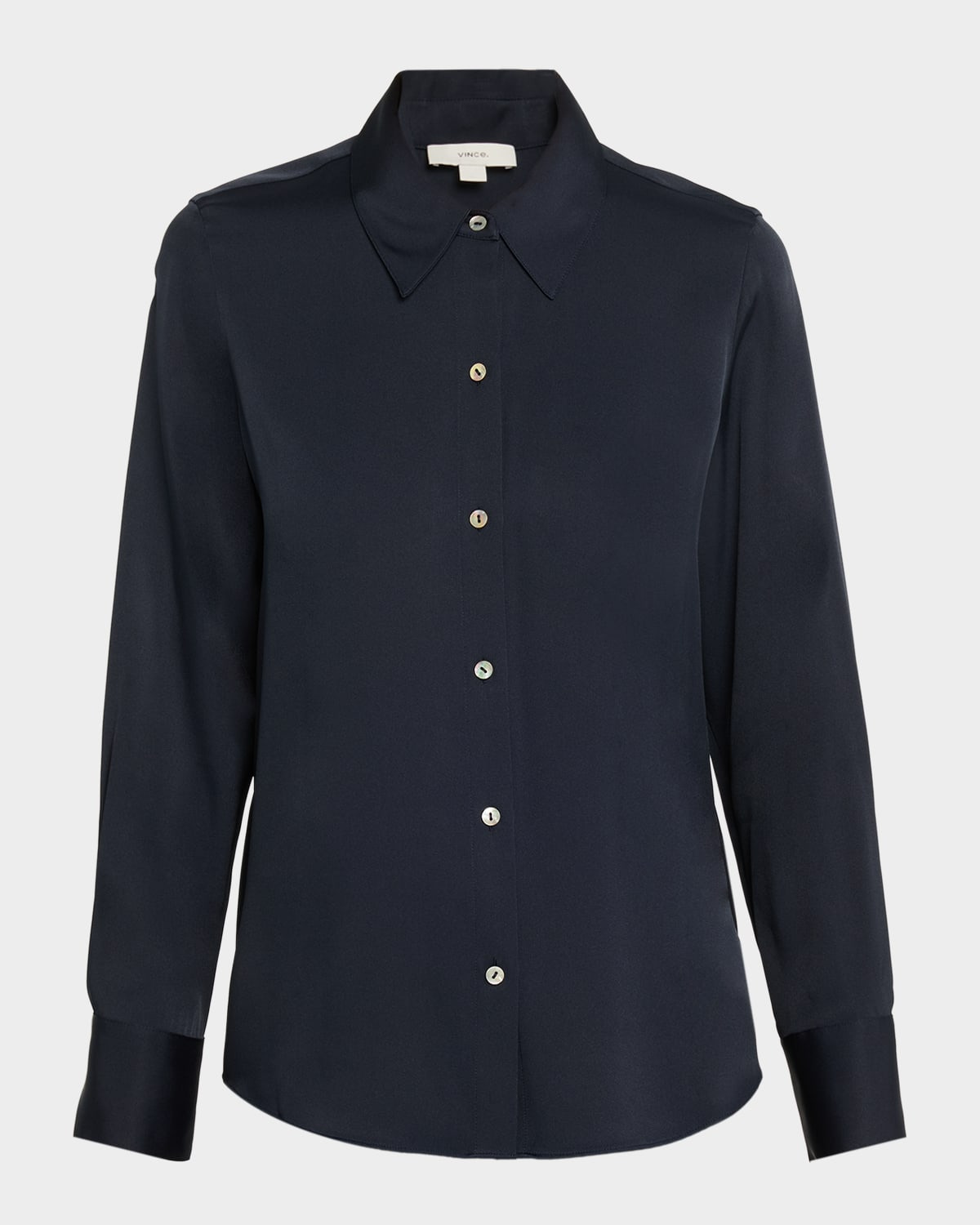 Vince classic stretch silk shirt Point collar Long sleeves with button cuffs Slim fit Hem falls to the hip Buttonfront Silk/viscose/spandex Hand wash cold or dry clean Imported