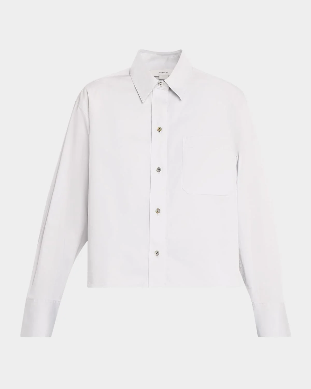 Vince shirt crafted from an ultra-fine cotton twill & nbsp; Point collar Long sleeves with button cuffs Chest pocket & nbsp; Cropped, boxy fit & nbsp; Button-front & nbsp; Cotton Machine wash cold Made in Peru SIZE & FITModel measurements: 5 & apos;10" tallModel is wearing a US size 4/Small