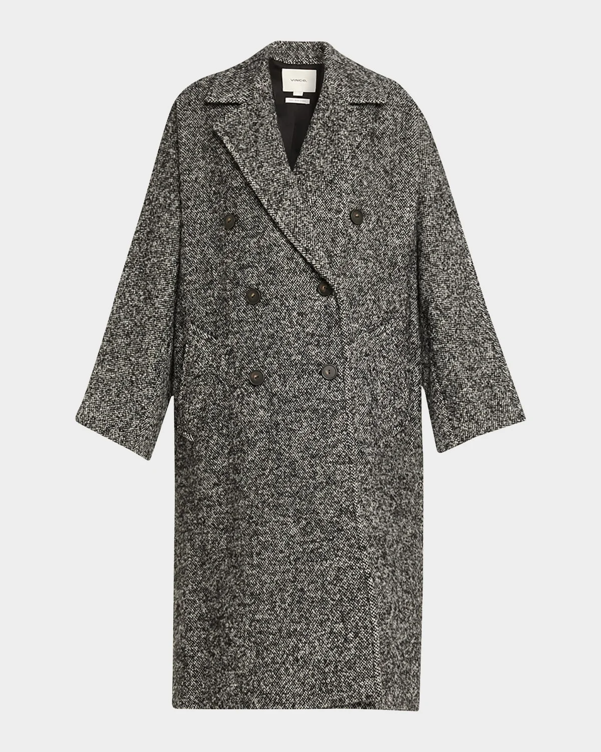 Overcoat crafted from melange woolblend by Vince. Wide notch lapels Doublebreasted front Long sleeves with button cuffs Side pockets Classic fit Hem falls below the knee Buttonfront Wool/polyester/acrylic Lining: Polyester Dry clean Imported