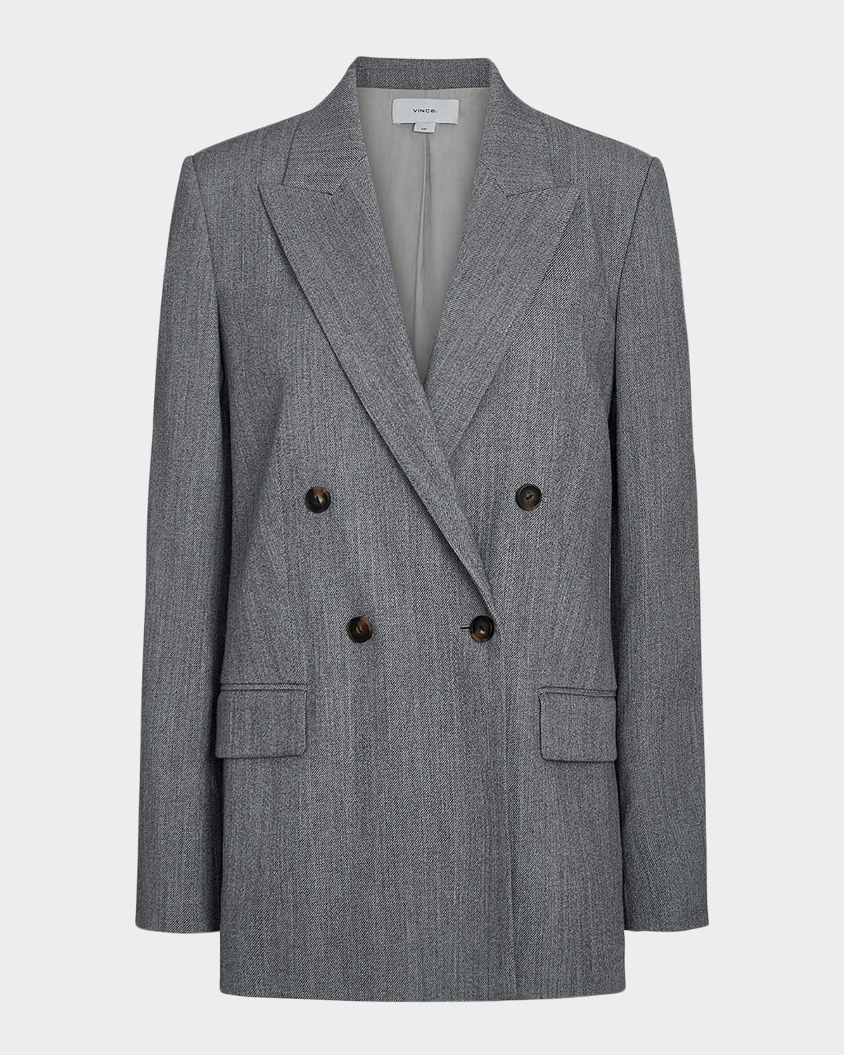 Vince solid wool twill blazer featuring a doublebreasted front Peak lapels Long sleeves with button cuffs Chest welt pocket Hip flap pockets Tailored fit Vented back Buttonfront Wool/viscose Lining: Polyester Dry clean or hand wash Imported