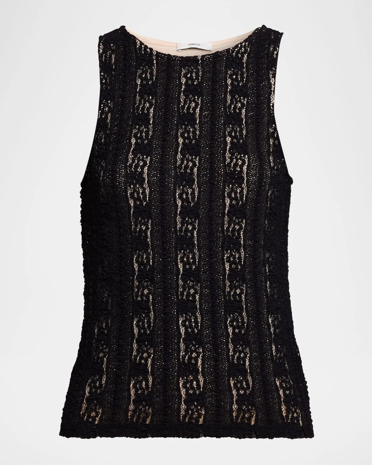 - Vince soft textured knit shell - High crew neckline - Sleeveless - Fitted - Hem sits at the hip - Pullover style - Cotton - Made in Portugal