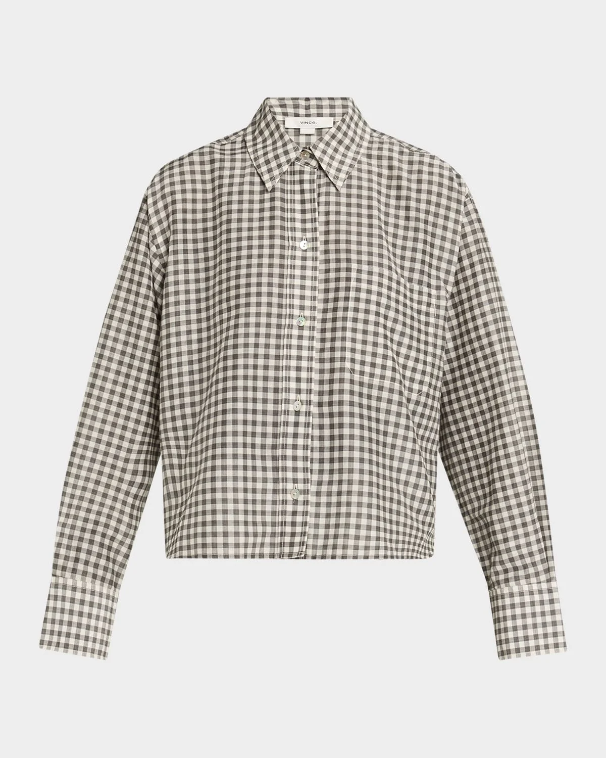 Vince shirt crafted from a lightweight cotton-silk blend in an all-over gingham check & nbsp; Point collar Dropped shoulders Long sleeves with button cuffs Chest pocket Boxy fit & nbsp; Cropped length Button-front & nbsp; Cotton/silk Hand wash Imported SIZE & FITModel measurements: 5 & apos;10" tallModel is wearing a US size 4/Small