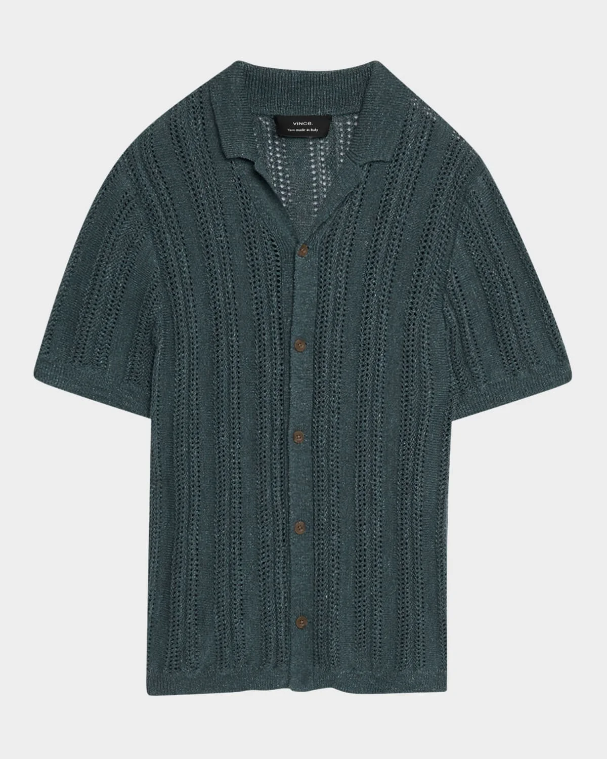 - Vince cabana shirt in textural open crochet stripes - Notched collar - Button-front closure - Short sleeves - Ribbed armbands and hem - Cotton/linen/polyester - Hand wash or dry clean - Imported