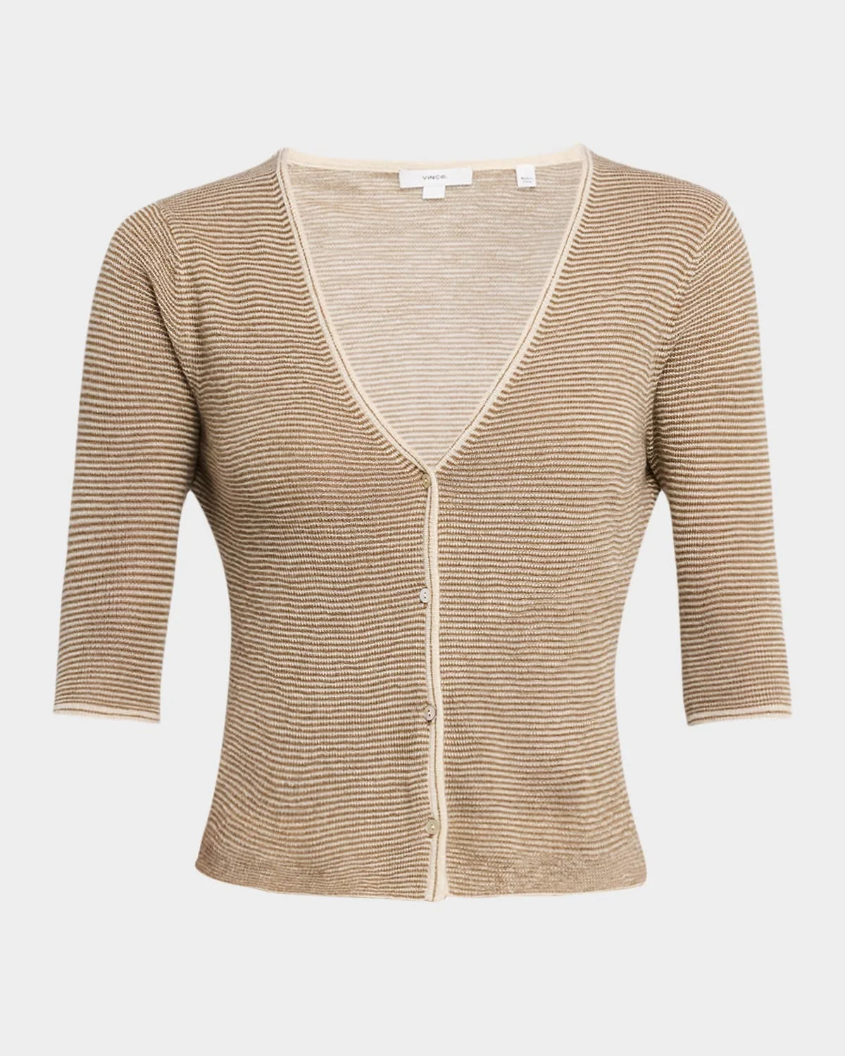 - Vince micro-stripe cardigan crafted from a luxurious cashmere-silk blend - V neckline - Three-quarter sleeves - Classic fit - Hem sits at the hip - Button-front - Cashmere/silk - Hand wash or dry clean - Imported