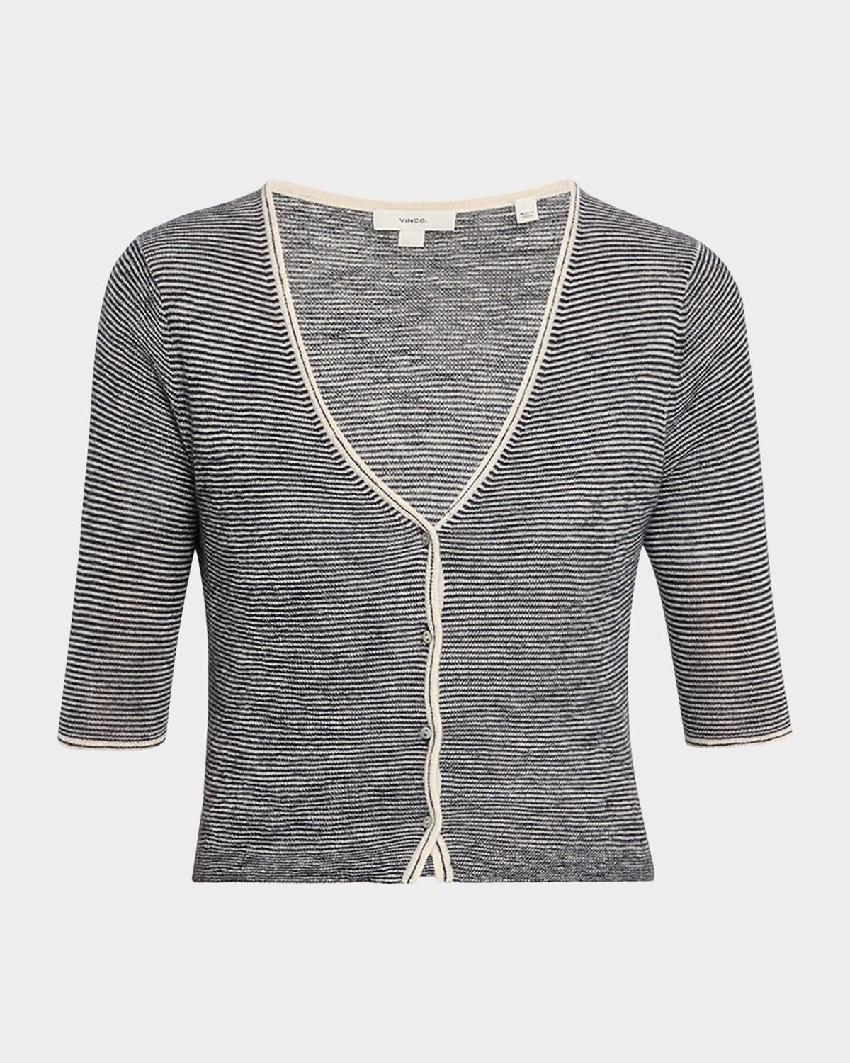 - Vince micro-stripe cardigan crafted from a luxurious cashmere-silk blend - V neckline - Three-quarter sleeves - Classic fit - Hem sits at the hip - Button-front - Cashmere/silk - Hand wash or dry clean - Imported