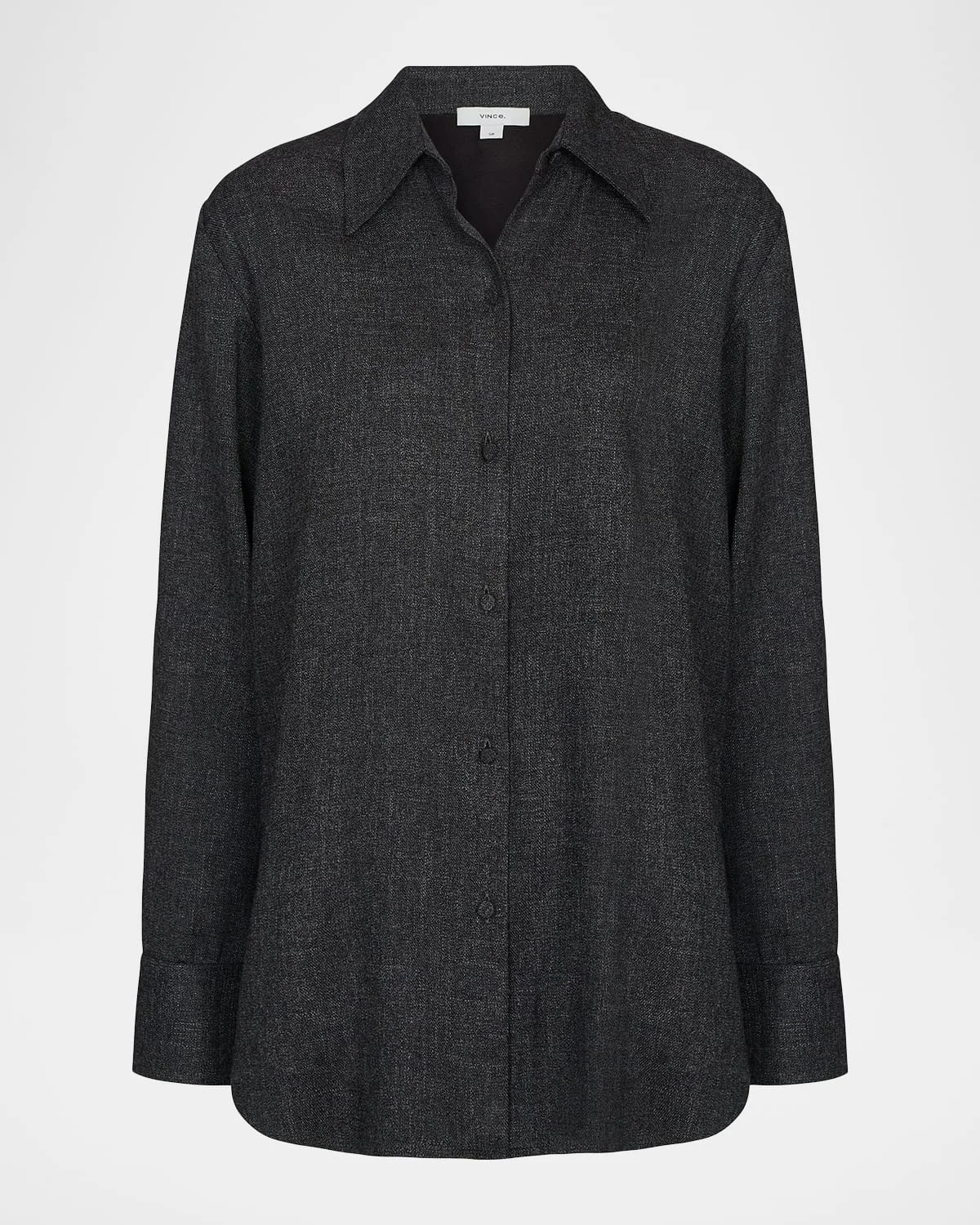 Tailored in an Italian jaspe fabric, this top by Vince boasts a clean silhouette with a soft hand feel. Point collar Long sleeves with button cuffs Relaxed fit Hem falls to the hip Buttonfront Viscose/linen/wool Hand wash or dry clean Imported