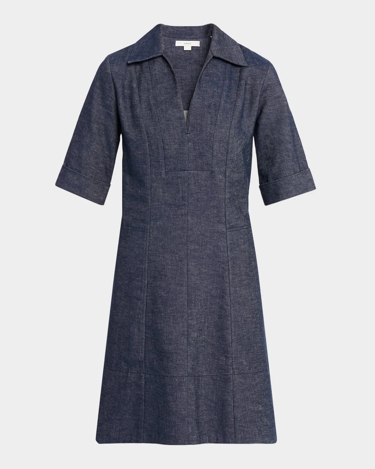 Vince paneled mini dress crafted from lightweight chambray Spread collar; V neckline Short sleeves A-line silhouette Hem falls above the knee Invisible side zip & nbsp; Cotton/modal Machine wash cold Imported SIZE & FITModel measurements: 5 & apos;10" tallModel is wearing a US size 4/Small