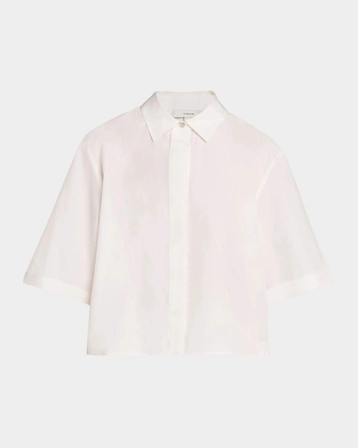 Vince blouse crafted from crisp cotton poplin Point collar Short sleeves Boxy fit & nbsp; Hem sits at the hip Hidden button-front & nbsp; Cotton Machine wash cold Made in Peru SIZE & FITModel measurements: 5 & apos;10" tallModel is wearing a US size 4/Small