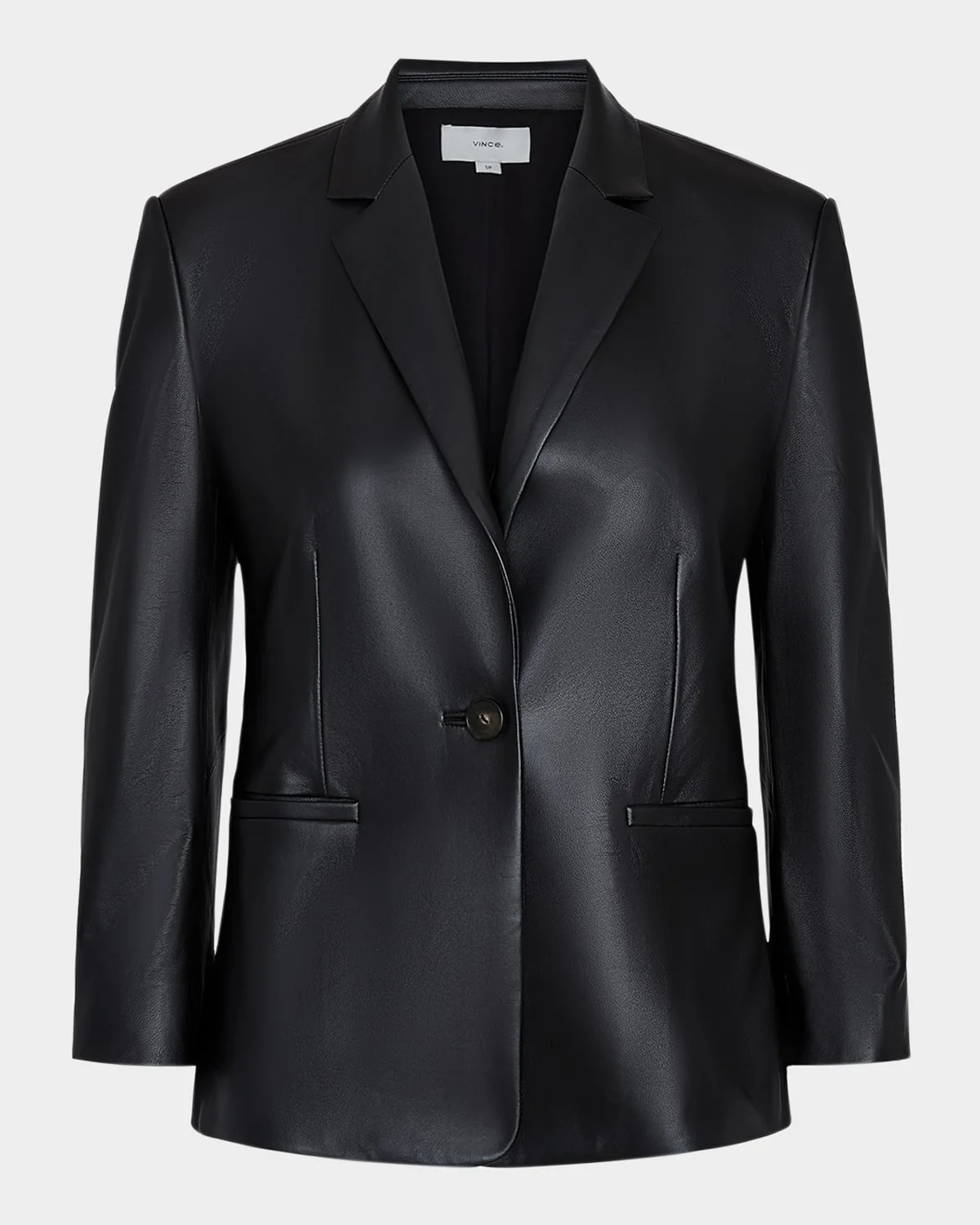 Vince shrunken leather blazer featuring a singlebreasted forrnt Notch lapels Threequarter sleeves with button cuffs Welt pockets Tailored fit Cutaway hem Buttonfront Leather Lining: Polyester Leather method dry cleaning Imported