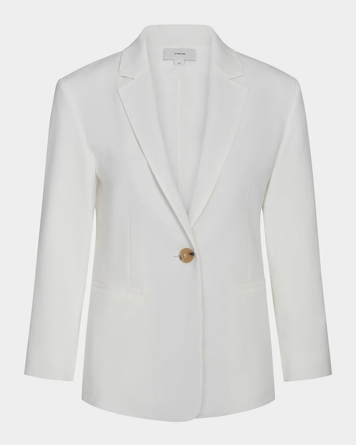 - Vince single-breasted blazer in linen-blend - Notch lapels - Three-quarter sleeves with button cuffs - Hip welt pockets - Shrunken fit - Single button-front - Linen/rayon/cellulose acetate/spandex - Lining: Polyester - Dry clean or hand wash - Imported - Shipping - Direct from Vendor, usually ships within 10 business days.