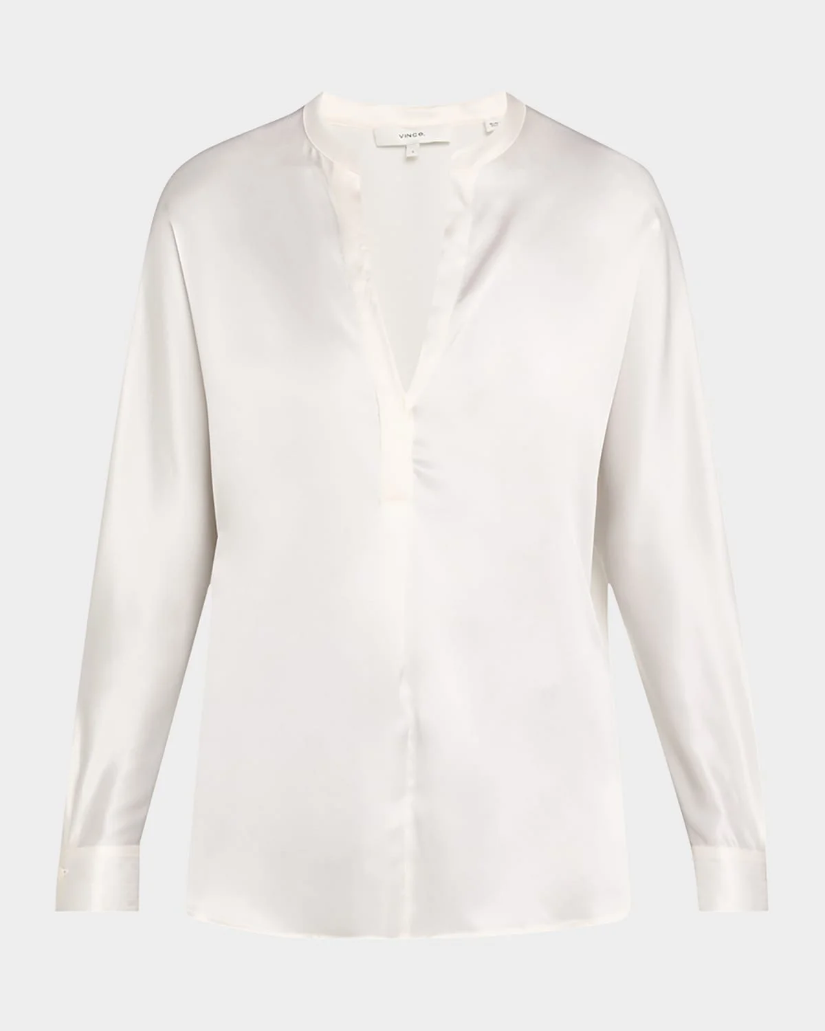 - Vince satin blouse. - V neckline with band collar. - Long sleeves; button cuffs. - Relaxed silhouette. - Shirttail hem. - Pullover style. - Silk. - Imported.