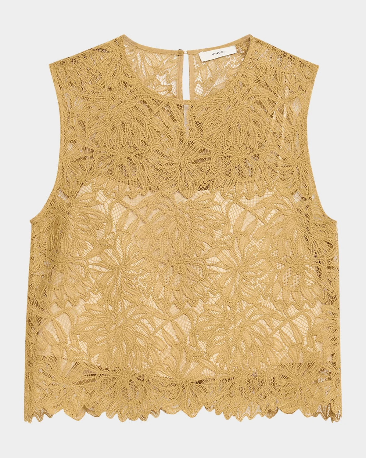 Vince top crafted from intricate, sheer floral lace & nbsp;and finished with a delicate scalloped hem & nbsp; Crew neckline Sleeveless Boxy fit Hem sits at the hip Back keyhole closure & nbsp; Polyester Lining: Polyester Hand wash cold Imported SIZE & FITModel measurements: 5 & apos;10" tallModel is wearing a US size 4/Small