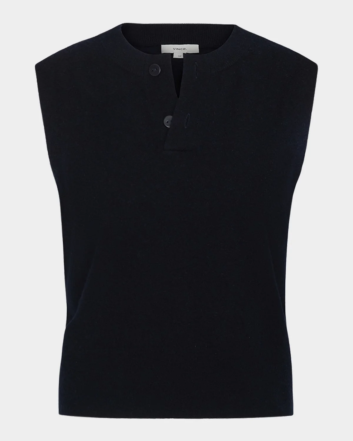 - Vince henley shell crafted from a soft wool-cashmere blend - Crew neckline; button placket - Sleeveless - Classic fit - Hem sits at the hip - Pullover style - Wool/cashmere/pbt - Hand wash or dry clean - Imported