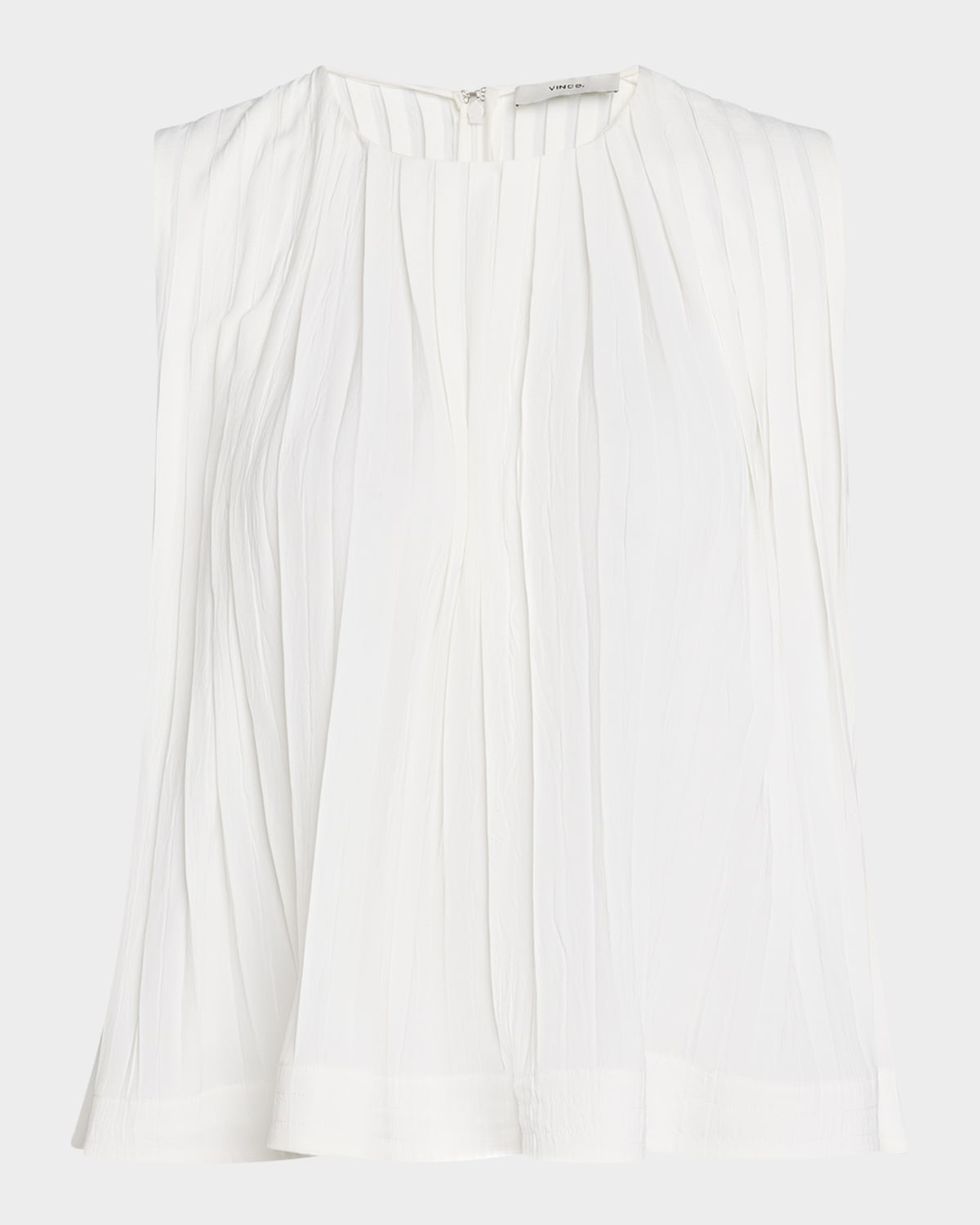 - Vince pleated top - Crew neckline - Sleeveless - Loose fit - Hem falls to the hip - Center back zip - Polyester - Lining: Polyester - Dry clean or hand wash - Imported
