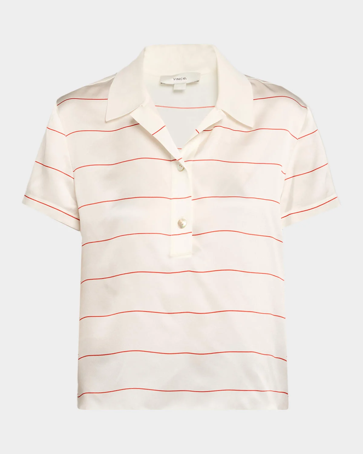 - Vince striped silk polo shirt finished with a knit collar - Short sleeves - Relaxed fit - Hem falls to the hip - Button-placket - Silk/viscose/nylon/polyamide - Dry clean or hand wash - Imported