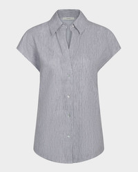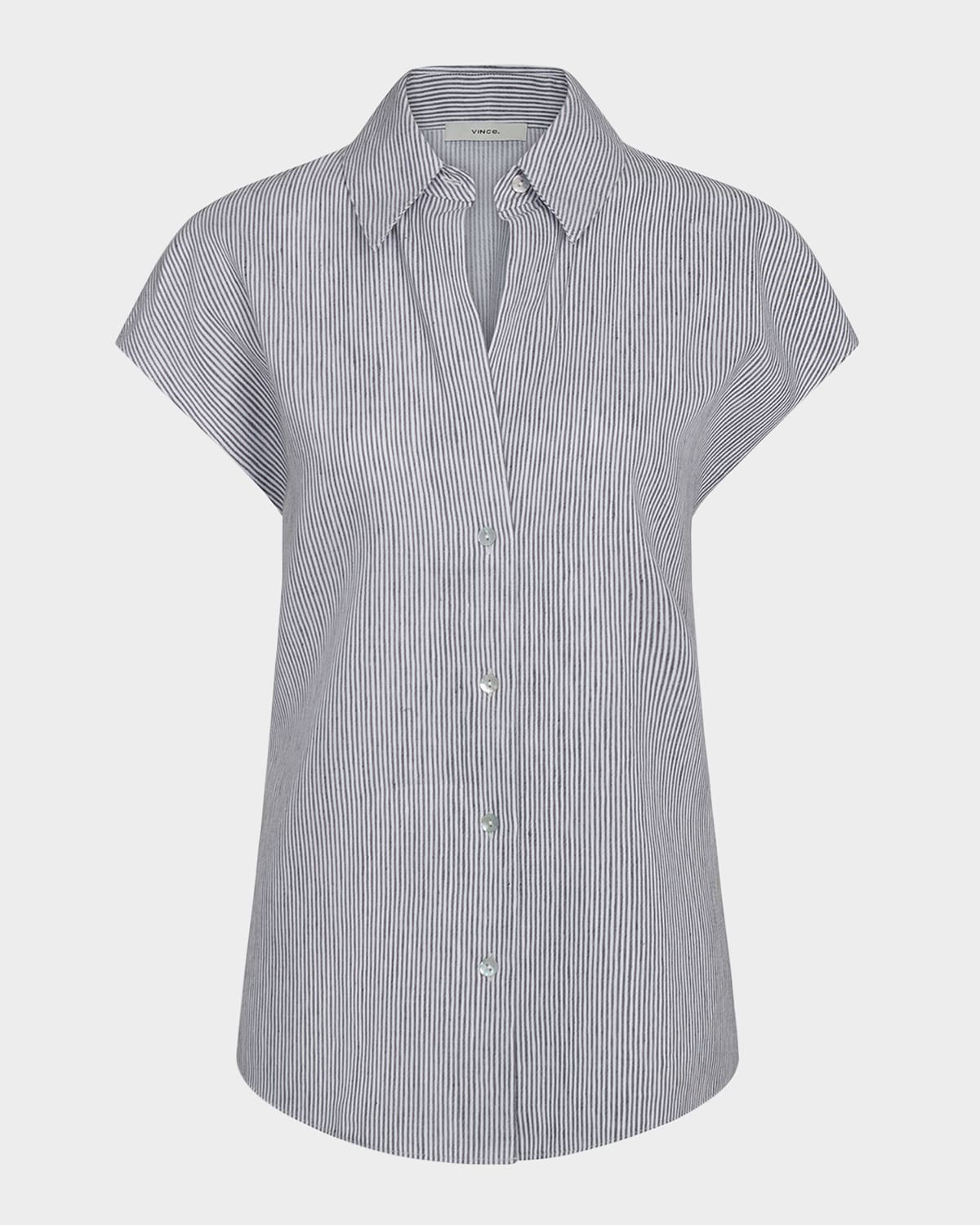 - Vince ticking striped blouse - Point collar - Cap sleeves - Relaxed fit - Rounded hem - Button-front - Linen/cotton - Dry clean or machine wash cold - Imported