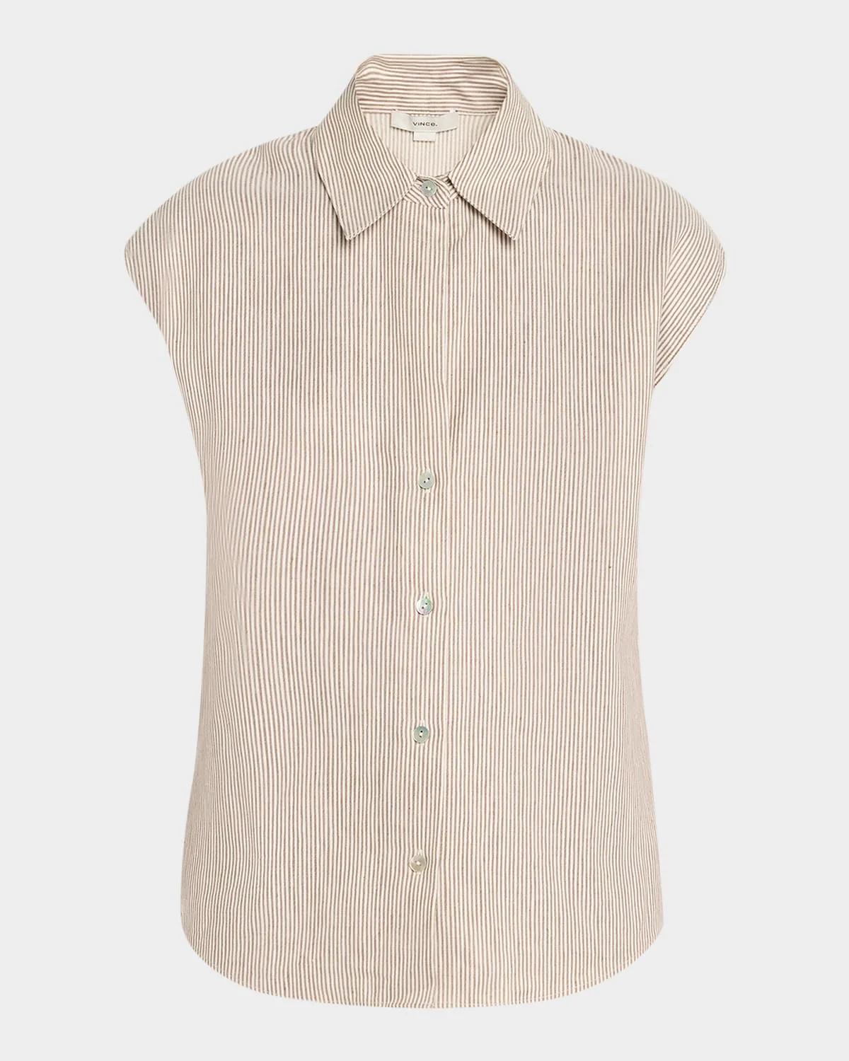 Vince ticking striped blouse & nbsp; Point collar & nbsp; Cap sleeves Relaxed fit Rounded hem Button-front & nbsp; Linen/cotton Dry clean or machine wash cold Imported Size Note:Item runs large, consider ordering a size down.
