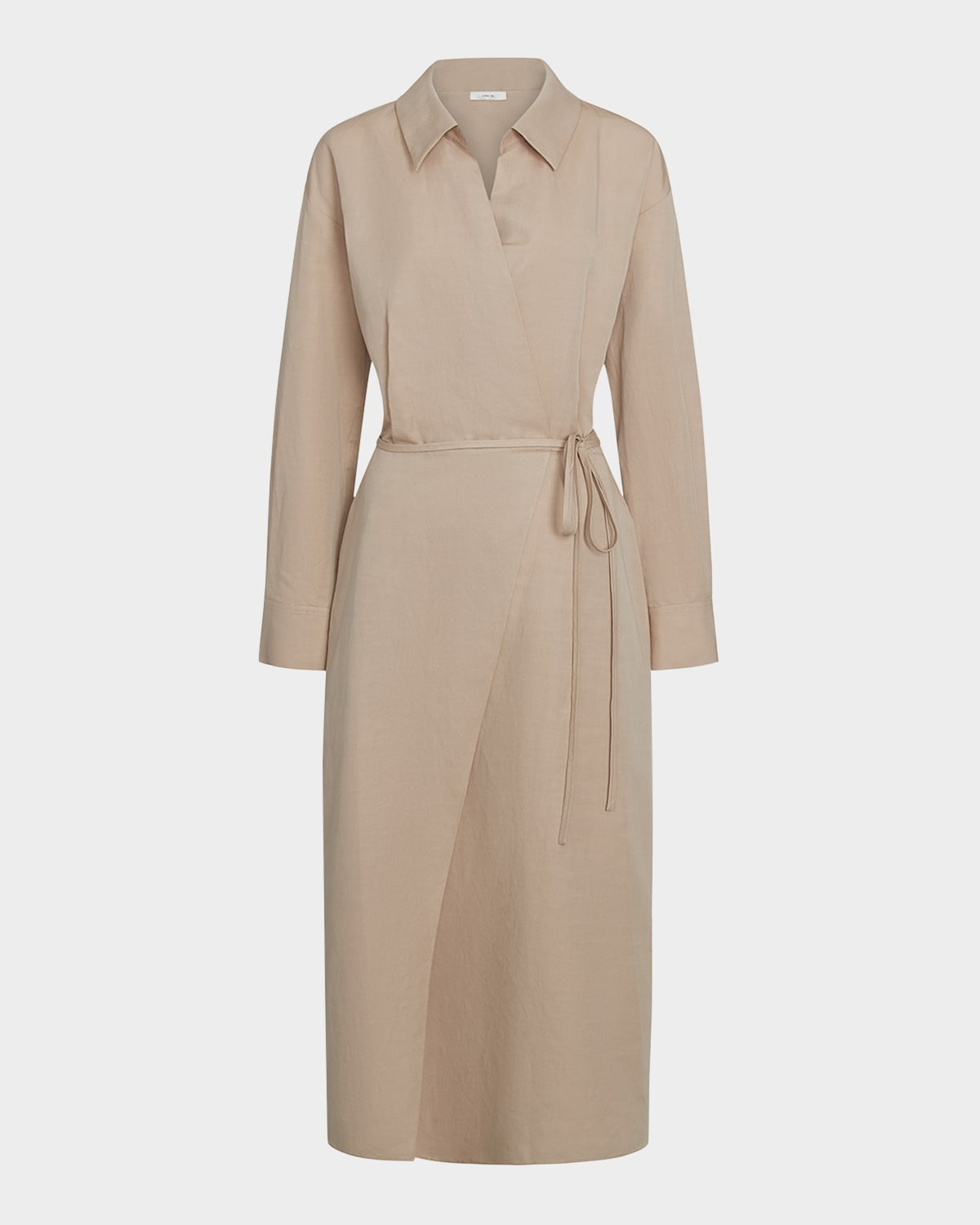 - Vince cotton-blend shirtdress - Point collar; V neckline - Long sleeves with button cuffs - Wrap silhouette - Hem falls below the knee - Side tie closure - Cotton/rayon/cellulose acetate/linen - Hand wash or dry clean - Imported - Shipping - Direct from Vendor, usually ships within 10 business days.