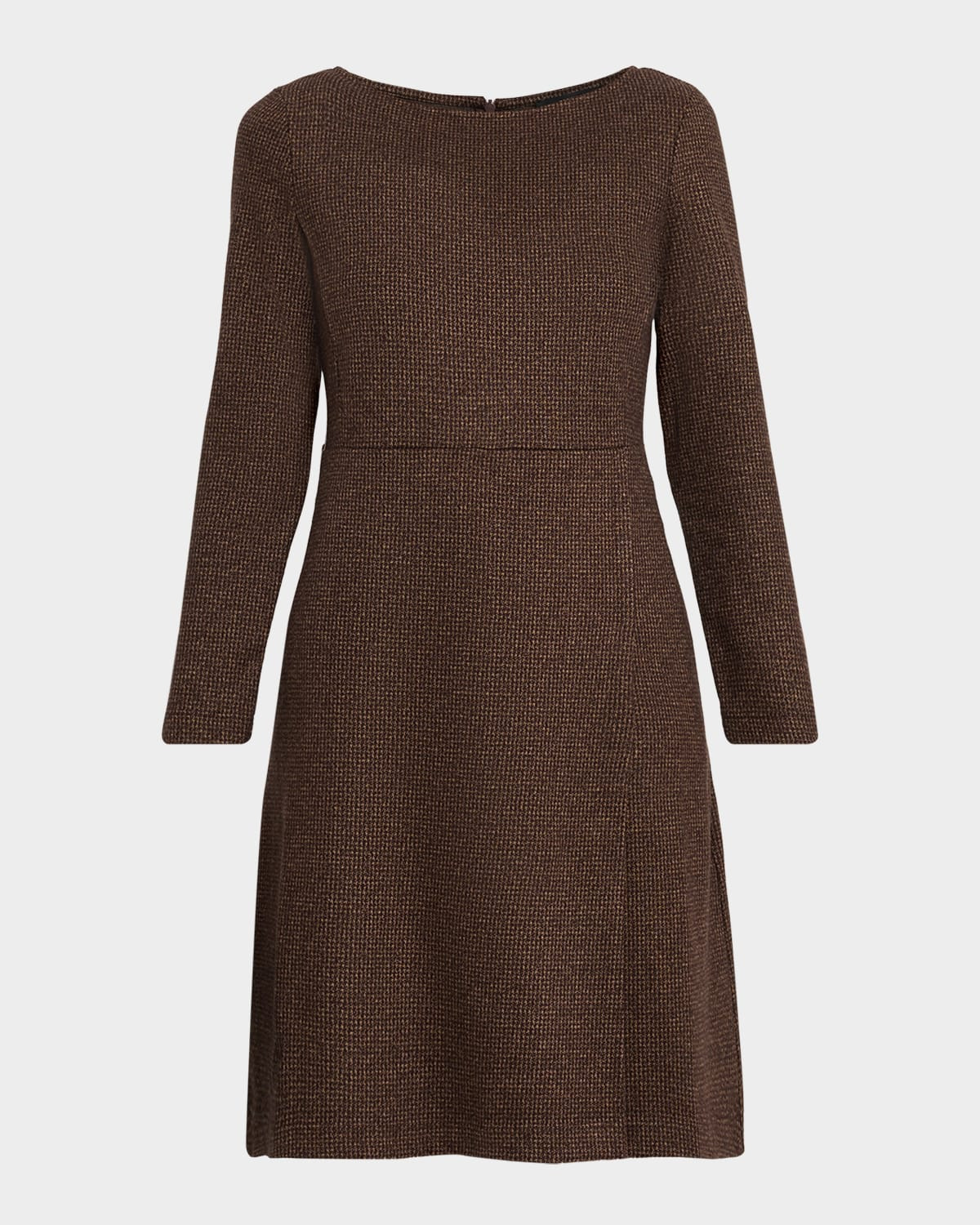 Weekend Max Mara "Balocco" jacquard jersey dress, cut at the waist with a sideoffset pleat for added movement Boat neckline Long sleeves Two side inset pockets Hem hits around the knee Aline silhouette Invisible back zipper Viscose/polyester/elastane Dry clean Imported