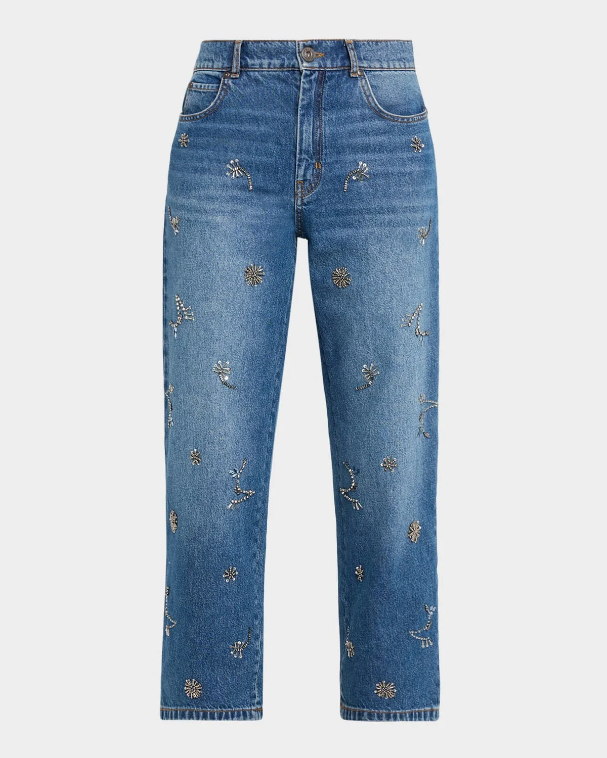 Crafted in medium-wash cotton denim, these & nbsp;Weekend Max Mara pants are decorated with beaded adornments on the front Mid-rise sits high on the hips Flat front Five-pocket style Cropped at the ankle Straight legs Button/zip fly; belt loops Cotton/nylon/polyamide Dry clean Made in Morocco