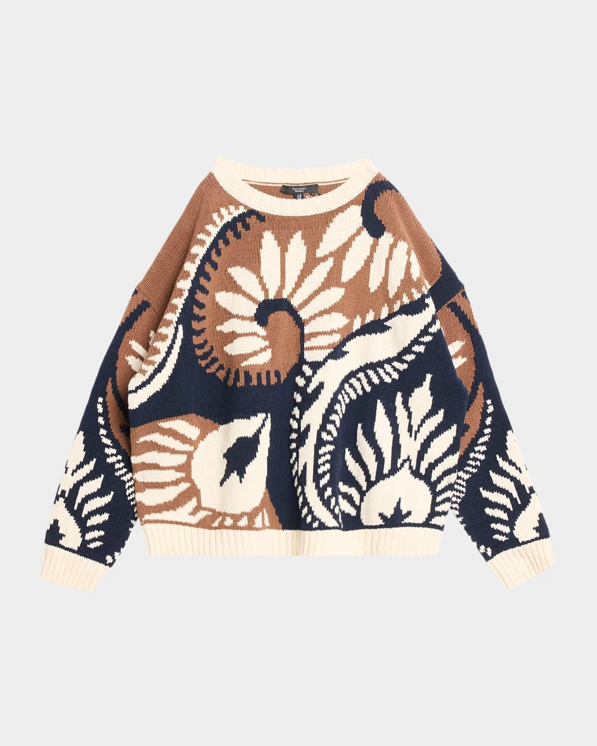 This Weekend Max Mara sweater is jacquard knit in a swirling, abstract design with solid rib-knit cuffs, collar, and hem Crew neckline Drop shoulders Long sleeves Relaxed fit Pullover style Cotton/acrylic Dry clean Made in Romania
