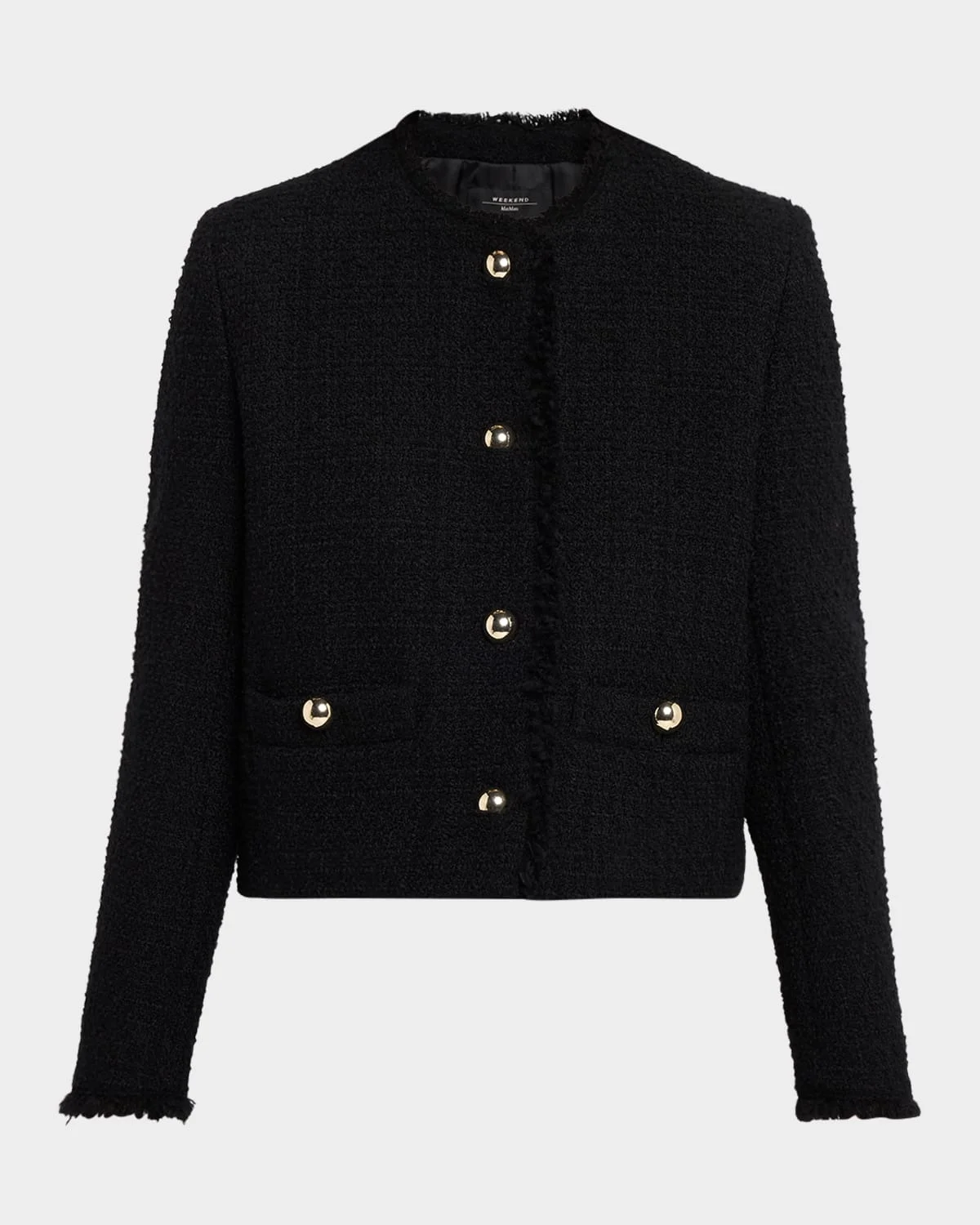 Crafted in a wool blend, this Weekend Max Mara jacket is detailed with fringe trim and gold-tone bauble buttons Crew neckline; button front Long sleeves Front welt pockets Hip length Straight fit Virgin wool/polyester Dry clean Made in Morocco