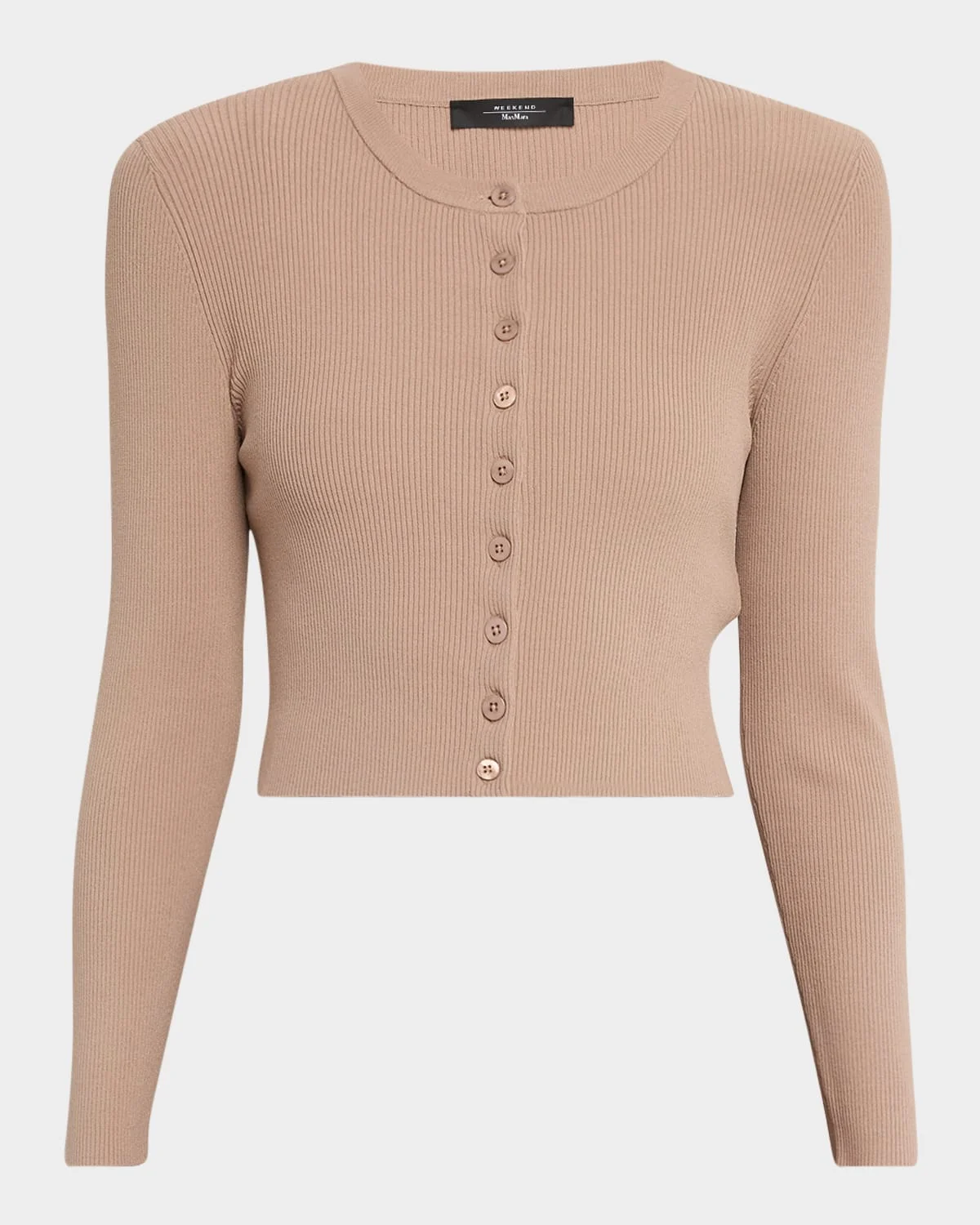 Weekend Max Mara "Magiaro" cardigan crafted in a rib knit viscose blend Crew neckline Bracelet sleeves Cropped style Slim fit Viscose/polyester Hand wash Imported