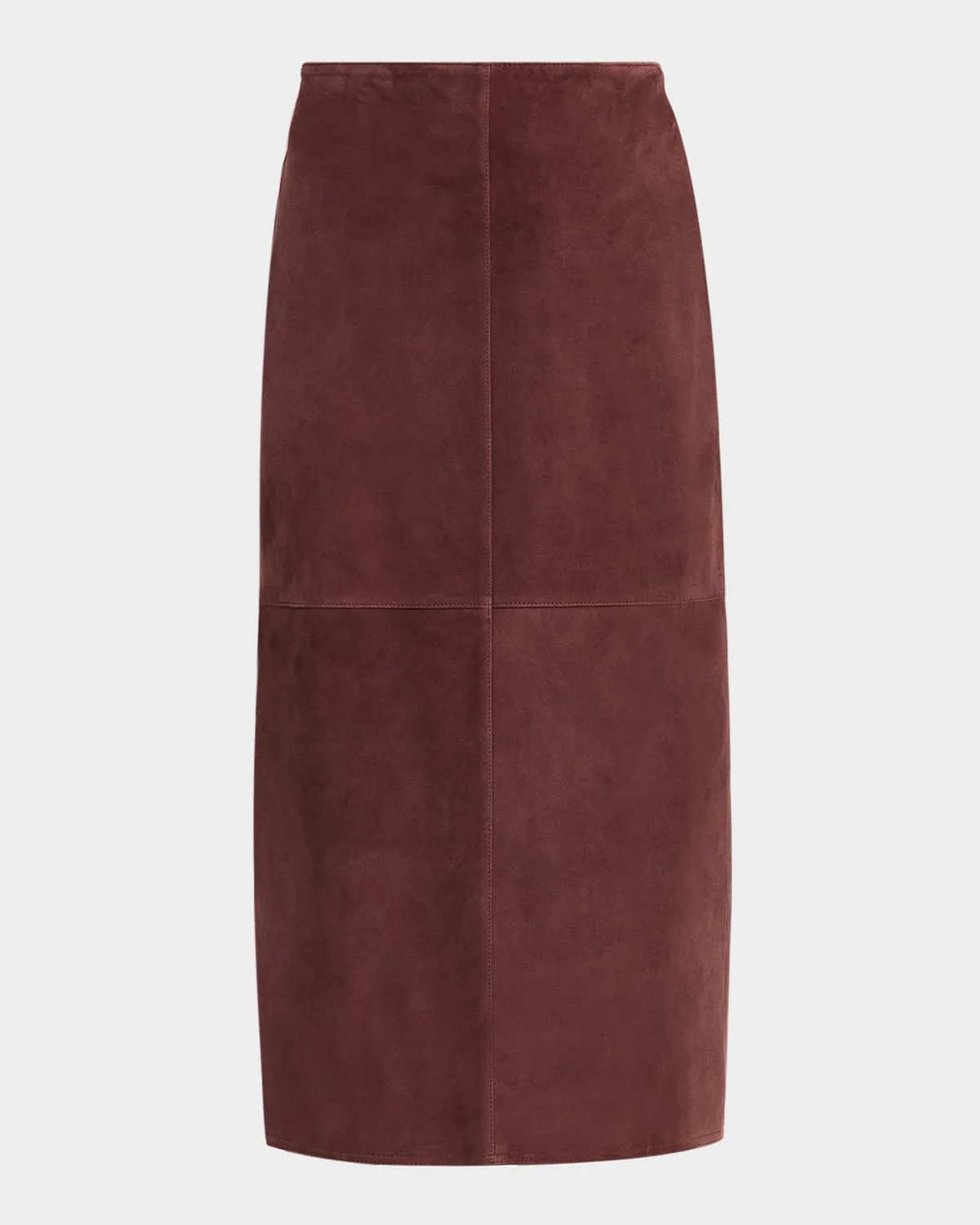 This "Pala" midi skirt from Weekend Max Mara is crafted in smooth suede with leatherstyle topstitched seams Sits high on the hips Center back slit eases movement Hem falls below the knee Straight silhouette Invisible side zipper Leather Dry clean Imported