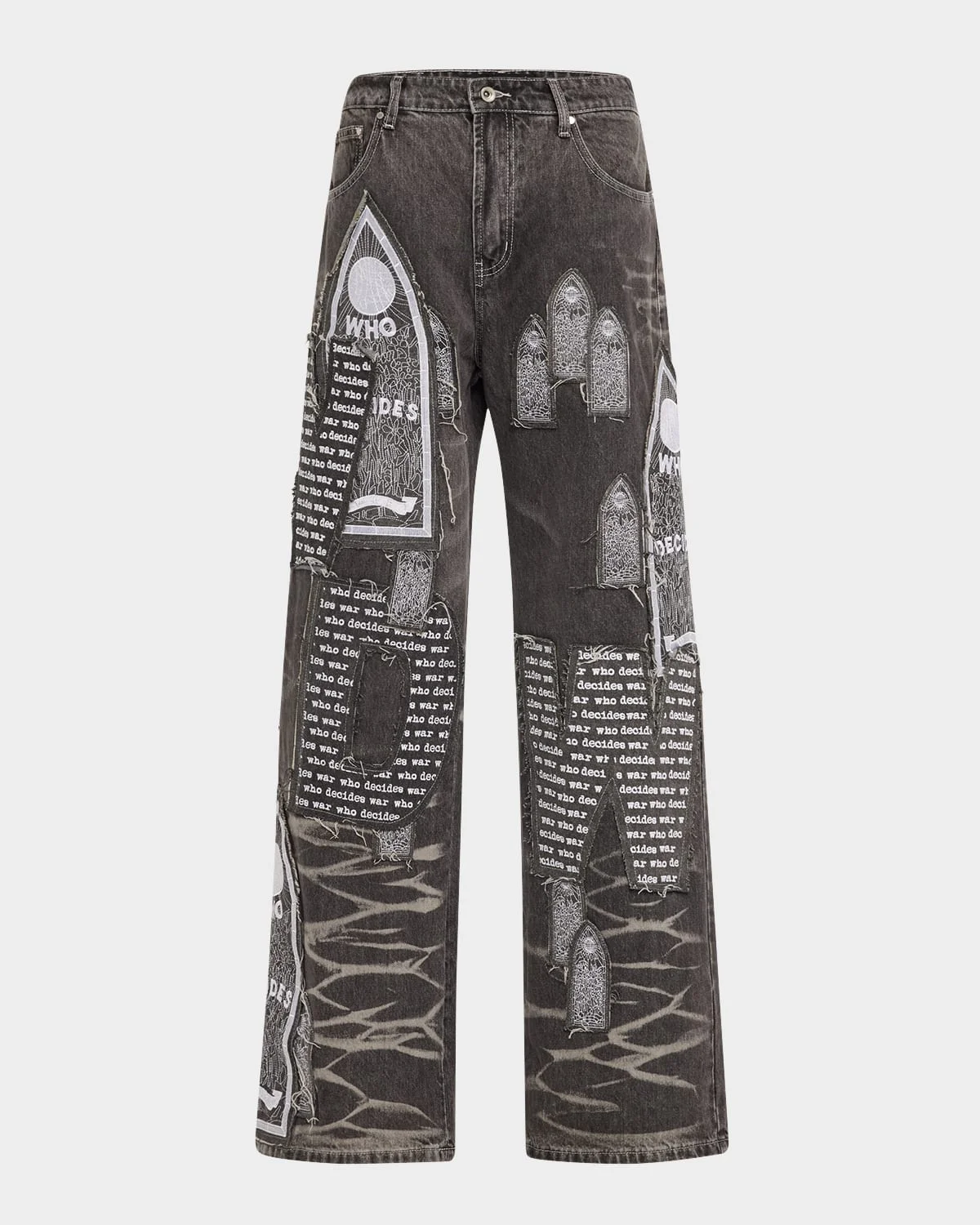 - WHO DECIDES WAR jeans in faded denim with logo letter patching and arched window embroidered artwork - Five-pocket style - Baggie legs - Full length - Cotton - Imported - Model is 6'1"/185cm.