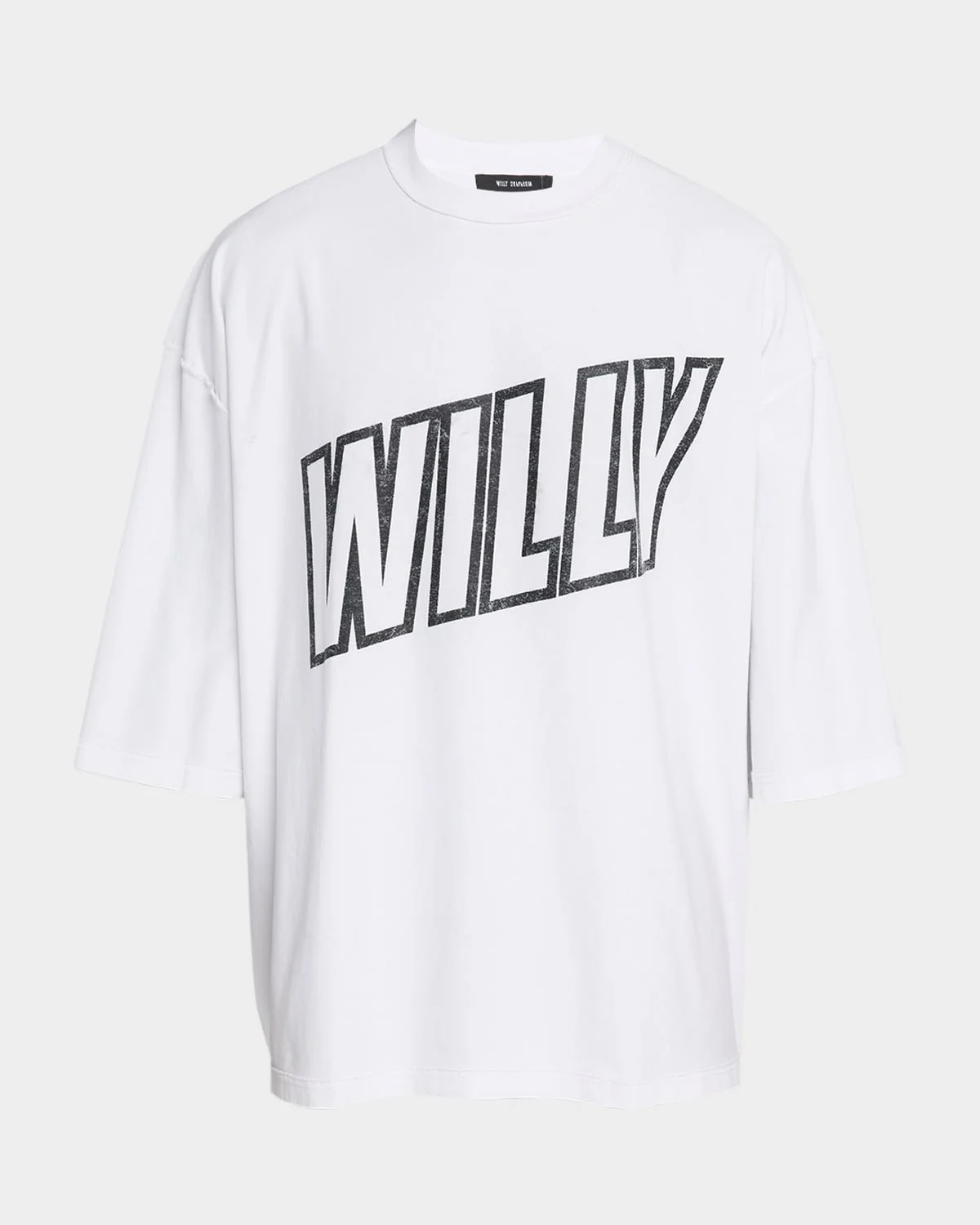 The Willy Chavarria "Inside Outwilly" Tshirt elevates branding with a screenprinted logo graphic on the front and the label on the back neck Crew neckline Short sleeves Oversized fit Pullover style Cotton Made in USA