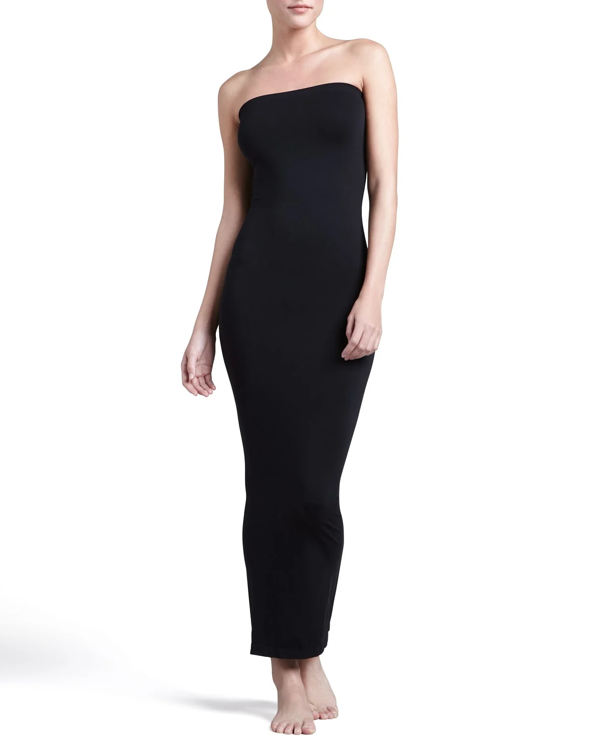 Wolford "Fatal" seamless dress in signature velvety knit May be worn as maxi dress, ruched tube dress, or pencil skirt-a great three-in-one piece for traveling Super-stretchy opaque jersey Square neckline Sleeveless Banded hems Fitted silhouette Pull-on style Nylon/spandex Made in Austria Model is 5 & apos;10"/177cm.