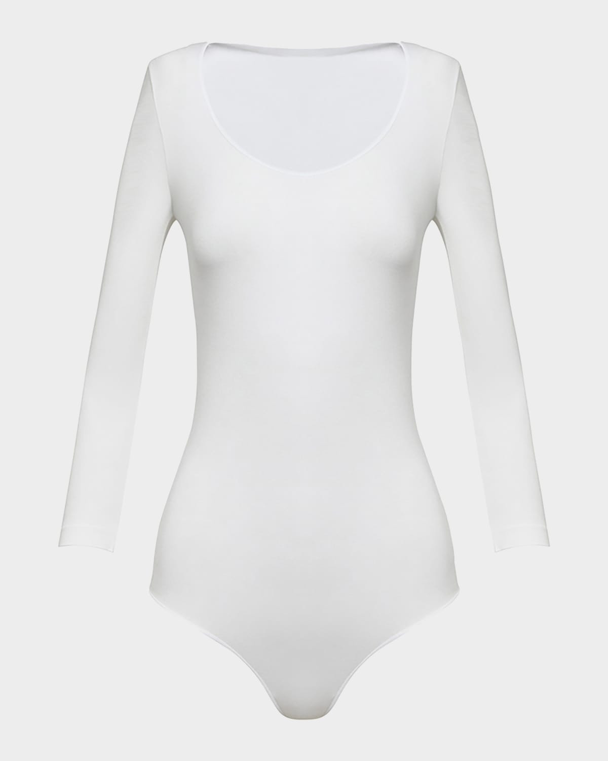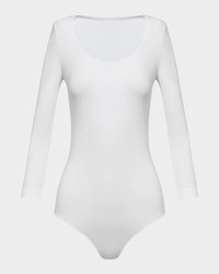 Wolford "Tokio" bodysuit in circularknit fabric Dyeing meets the bluesign® standard for chemical, water, and energy usage Openings reinforced with hidden elastic tape Scoop neckline 3/4 sleeves Highcut legs Minimal seat coverage Cottonlined snap gusset Modal/elastane Machine wash cold Made in Slovenia