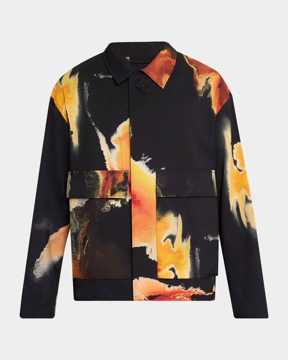 The Y3 jacket showcases abstract artwork, inspired by amber ink to represent warmth and energy. Point collar; throat latch Concealed button placket Hip flap pockets Buttoned cuffs Elasticized hem Wash delicate cycle. Lay flat to dry Highdensity polyethylene plastic type (hdpe) Imported