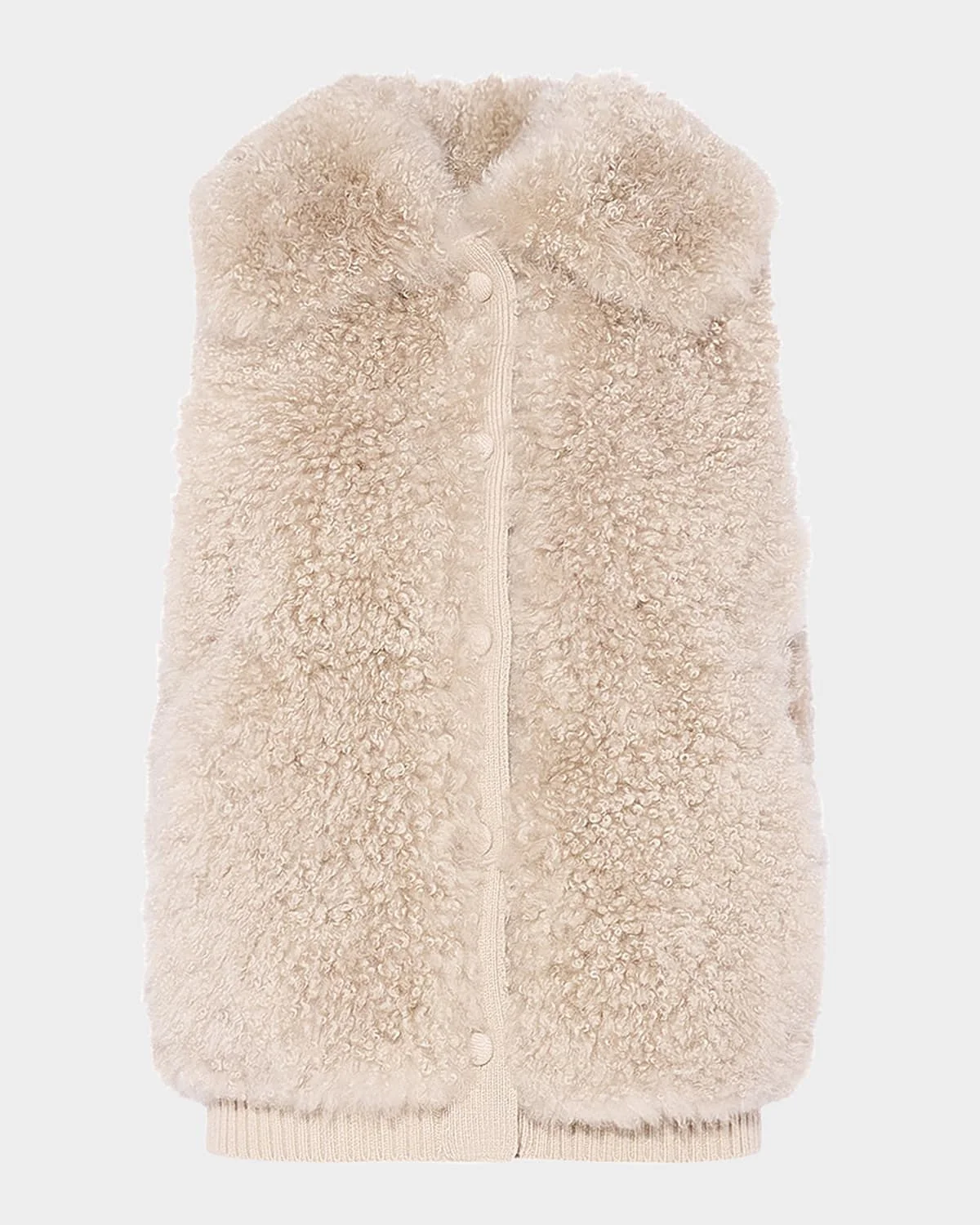 Crafted in a dyed, curly shearling (China), this Yves Salomon vest is finished with ribbed knit trim for a refined silhouette. Wide collar Sleeveless Classic fit Buttonfront Shearling Dry clean Made in France