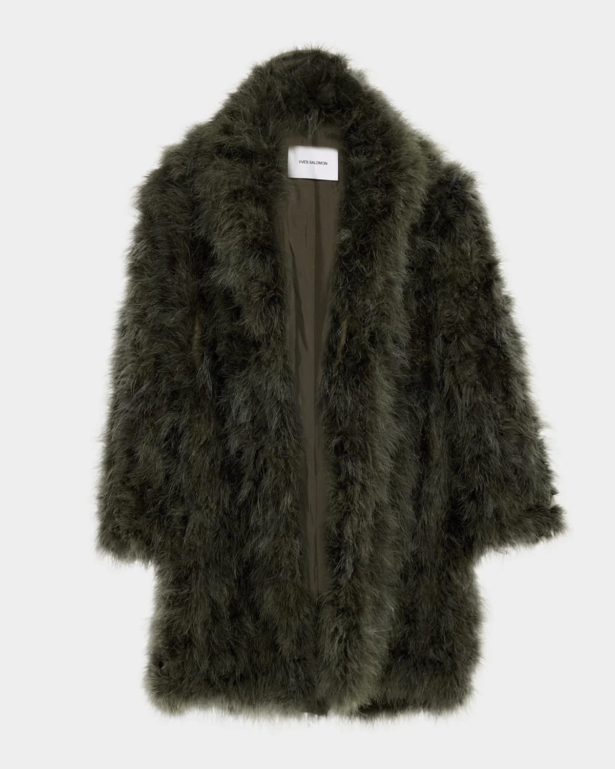 Crafted from dyed turkey feathers, the Yves Salomon overcoat offers sumptuous, lightweight warmth for an effortlessly glamorous look. Approx. 37.8"L from shoulder to hem Shawl collar Long sleeves Side slit pockets Relaxed fit Hookandeye closure Feather Lining: Silk Do not iron, professional cleaning recommended Imported