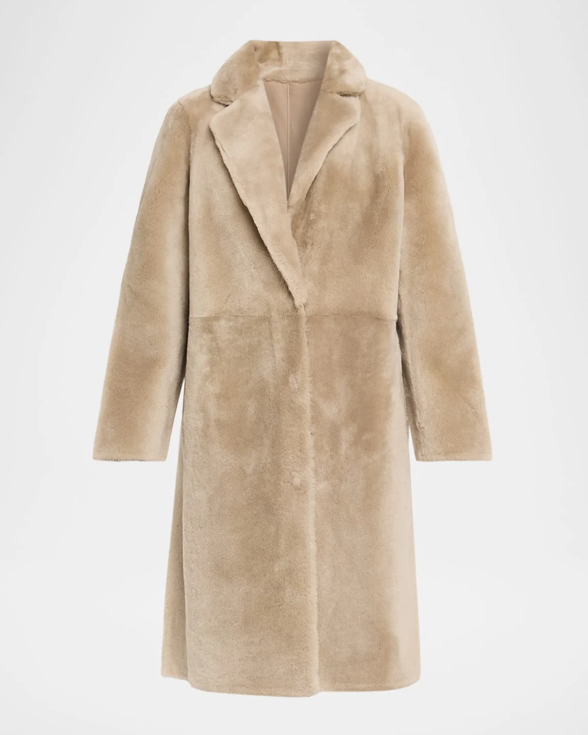 Yves Salomon long coat in dyed lamb shearling (Spain). Notched collar. Long sleeves. Snap placket front. Aline silhouette. Hem hits at knee. Made in France.