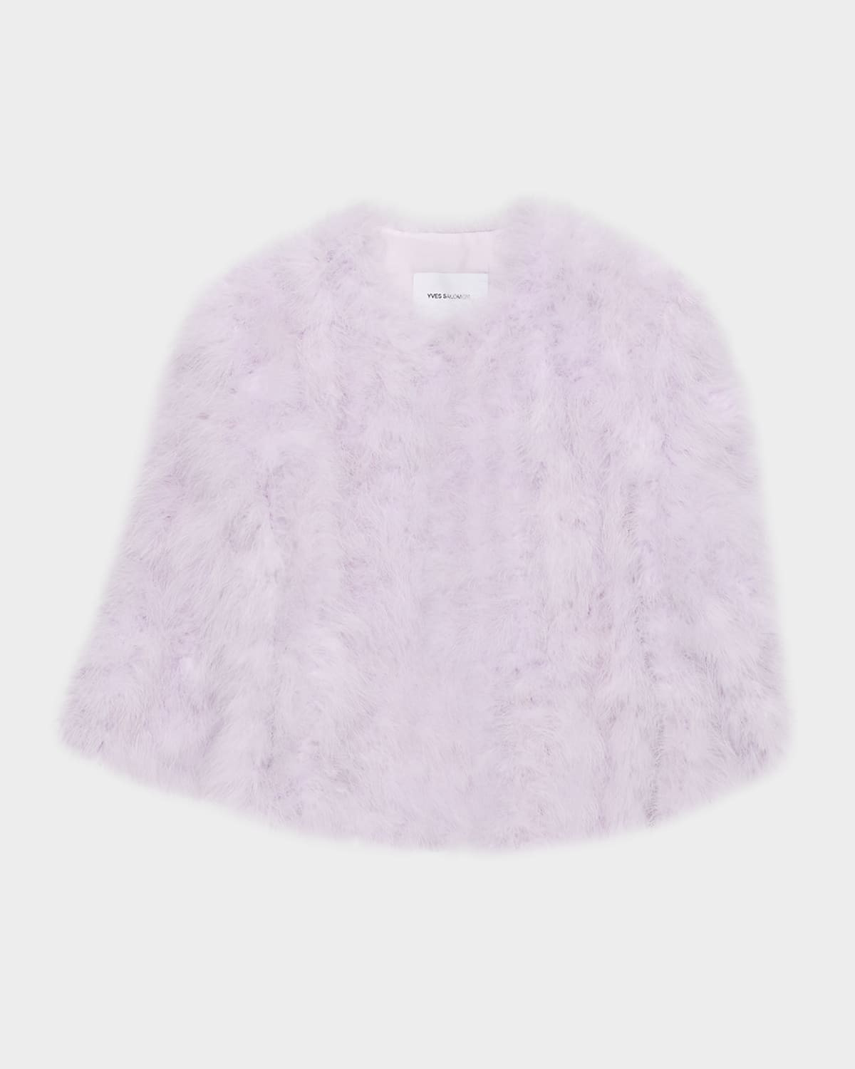 - Crafted in dyed turkey feathers (United States), this Yves Salomon jacket features a minimalist design and a lightweight, airy feel that is perfect for versatile styling. - Crew neckline - Three-quarter sleeves - Classic fit - Cropped length - Front hook closure - Feather - Lining: Silk - Professional cleaning recommended - Made in France