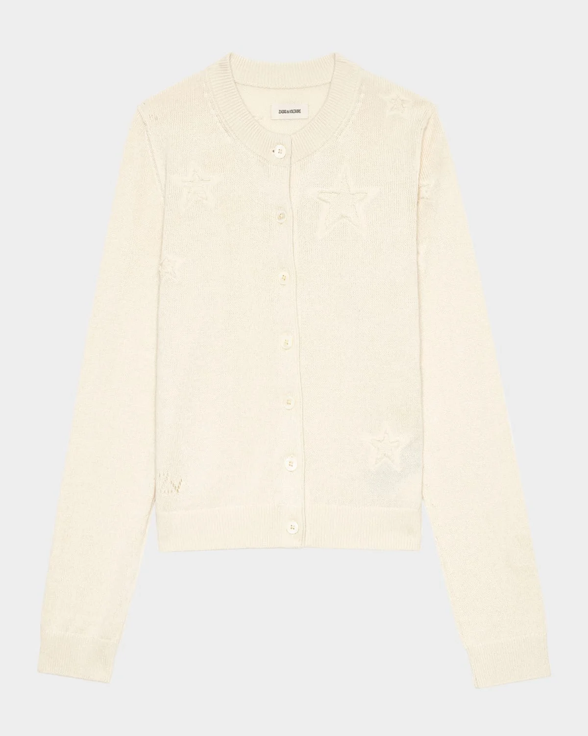 - Zadig & Voltaire cashmere-blend cardigan with star detailing - Crew neckline - Long sleeves - Hip length - Ribbed cuffs and hem - Button front closure - Cotton/silk/cashmere - Machine wash cold - Imported