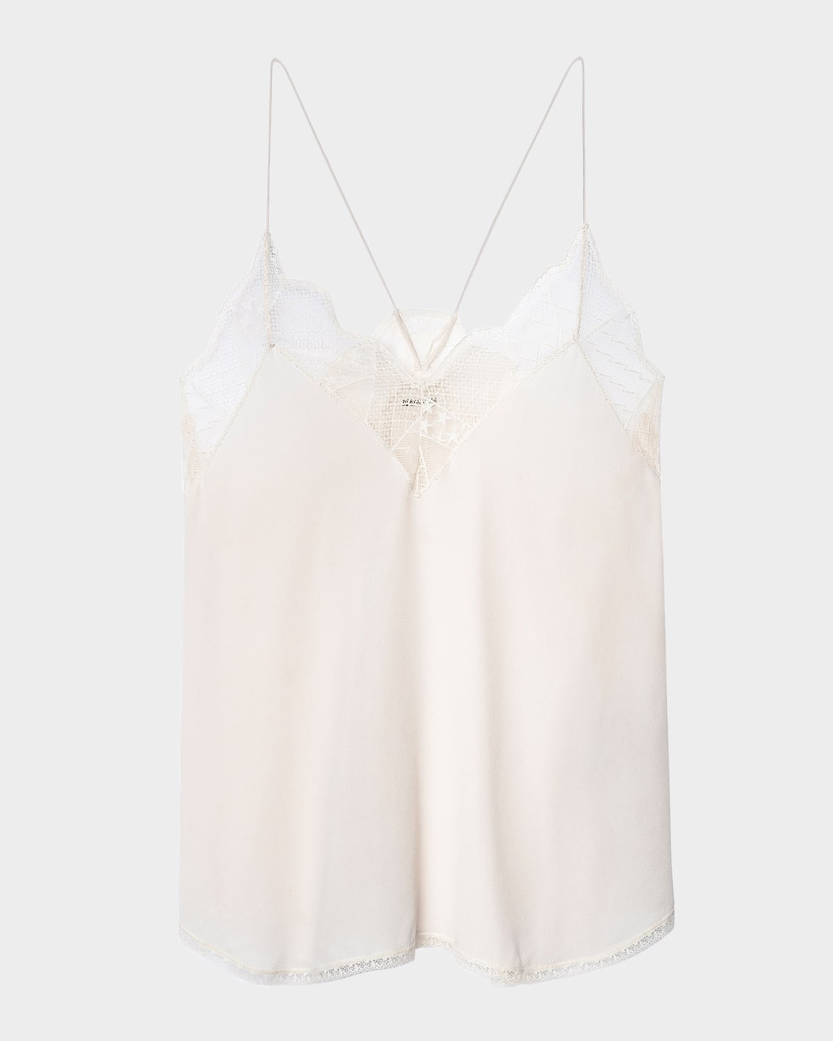 - Zadig & Voltaire "Christy" crepe de chine camisole trimmed with delicate lace - V neckline - Sleeveless - Relaxed fit - Hip length - Slipover style - Silk - Dry clean - Imported