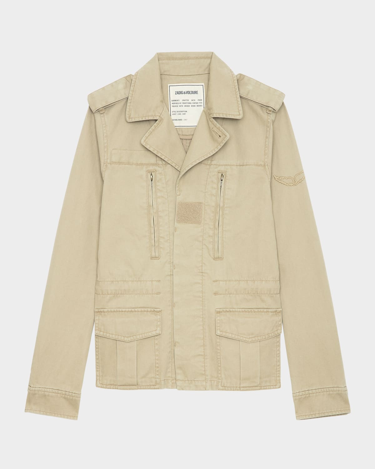 - Zadig & Voltaire "Klimi" military-inspired washed cotton parka - Notched collar - Shoulder epaulettes - Long sleeves; zipped cuffs with buttoned tabs - Two zipped chest pockets - Two side pockets with pointed flaps - Mid-length - Relaxed fit - Button front closure - Cotton - Machine wash cold - Imported