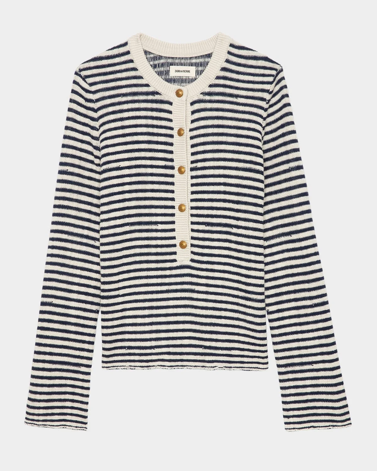 - Zadig & Voltaire "Mandala" sailor-inspired sweater boasts a classic striped design and golden embossed-dome buttons - Collarless neckline; partial button front - Long sleeves - Classic fit - Hip length - Pullover style - Cotton/viscose/linen - Machine wash cold - Imported