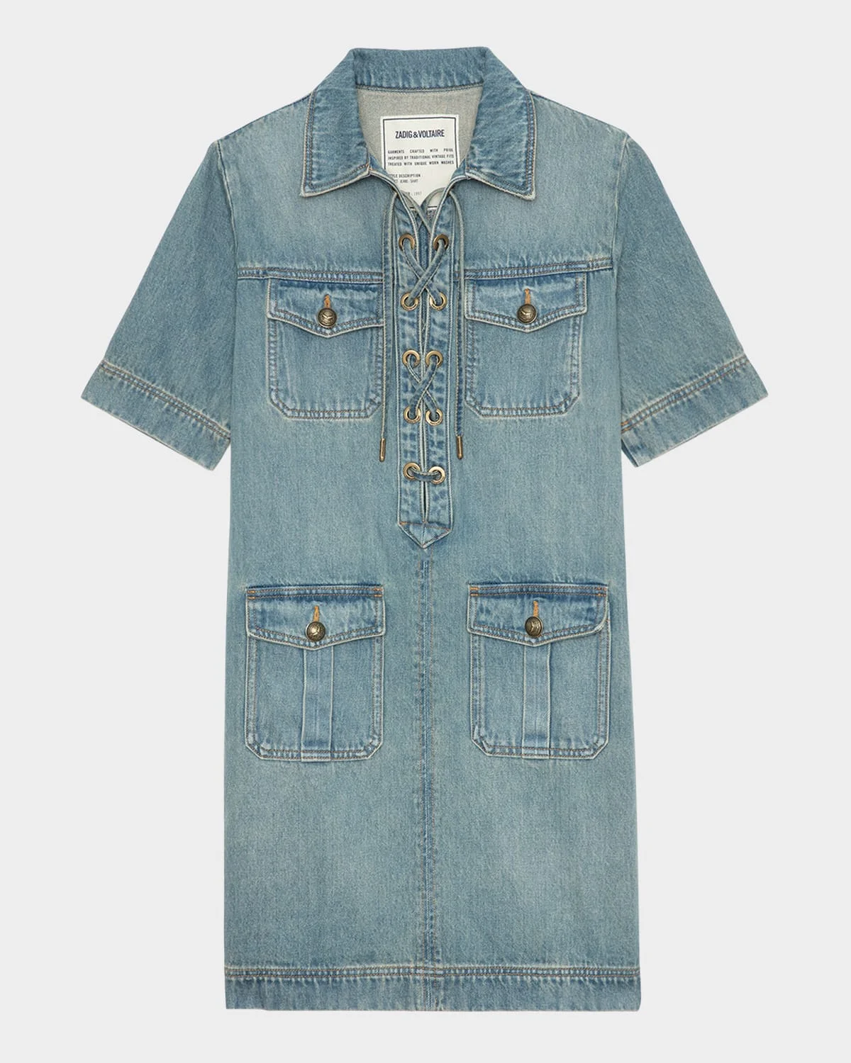- Zadig & Voltaire "Record" medium-wash denim dress finished with structural seaming and a lace-up front - Collared V neckline - Elbow-length sleeves - Front patch pockets - Hem falls above the knee - A-line silhouette - Cotton - Machine wash cold - Imported
